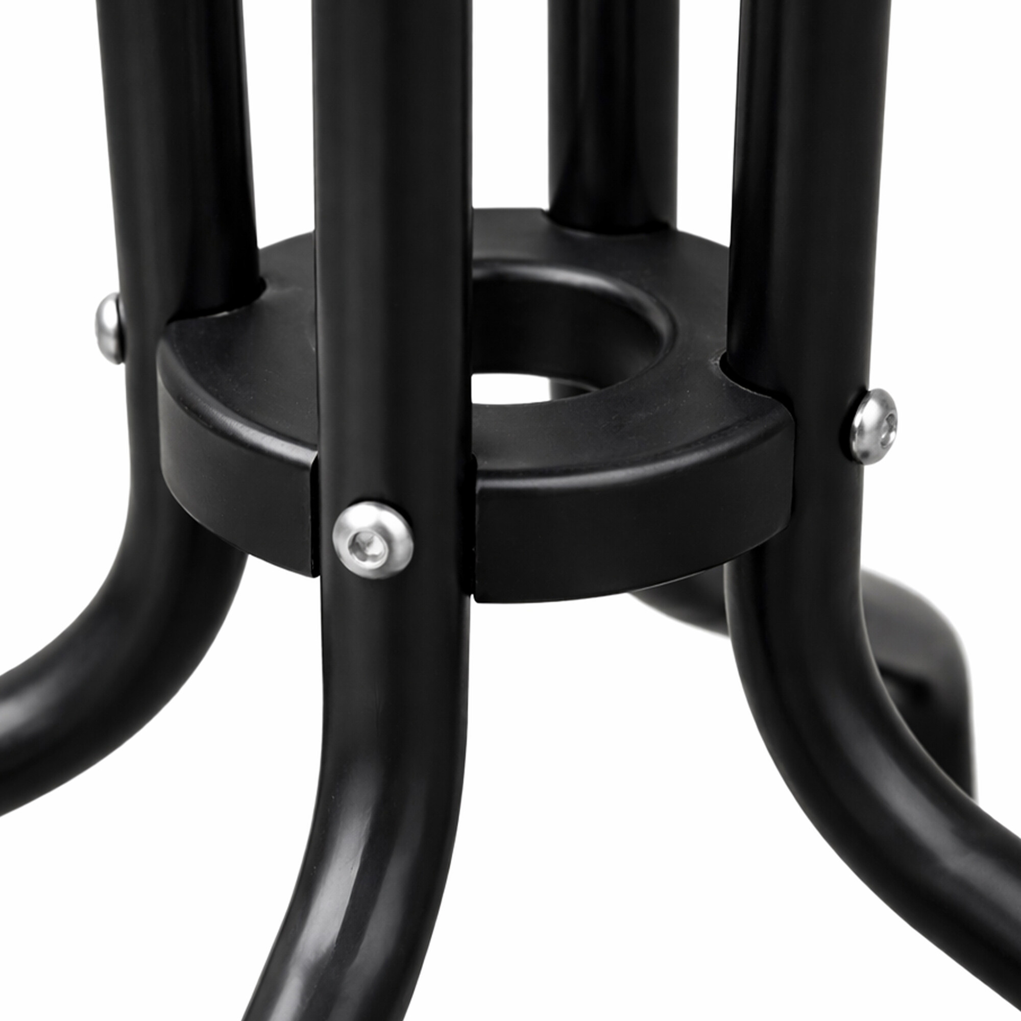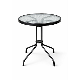Kulatý zahradní stůl s pevným kovovým rámem a texturovanou skleněnou deskou, vhodný pro zahrady, terasy, kavárny, altánky, balkóny.