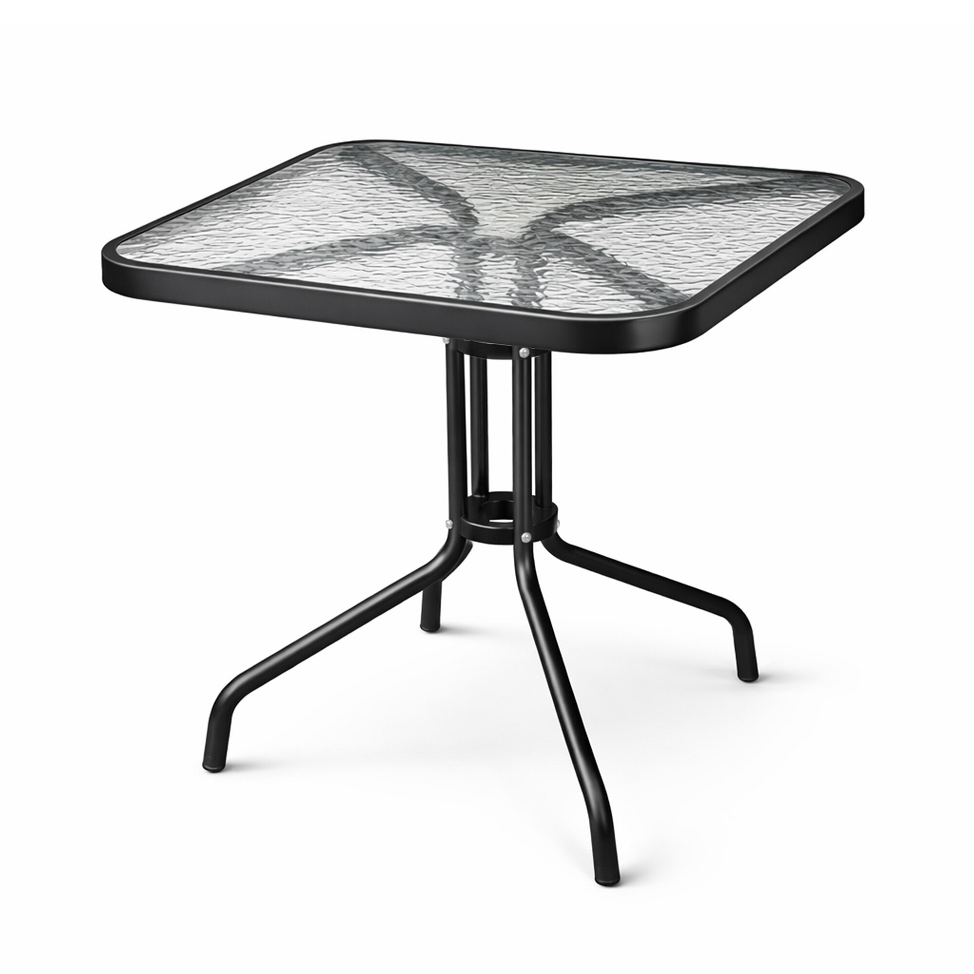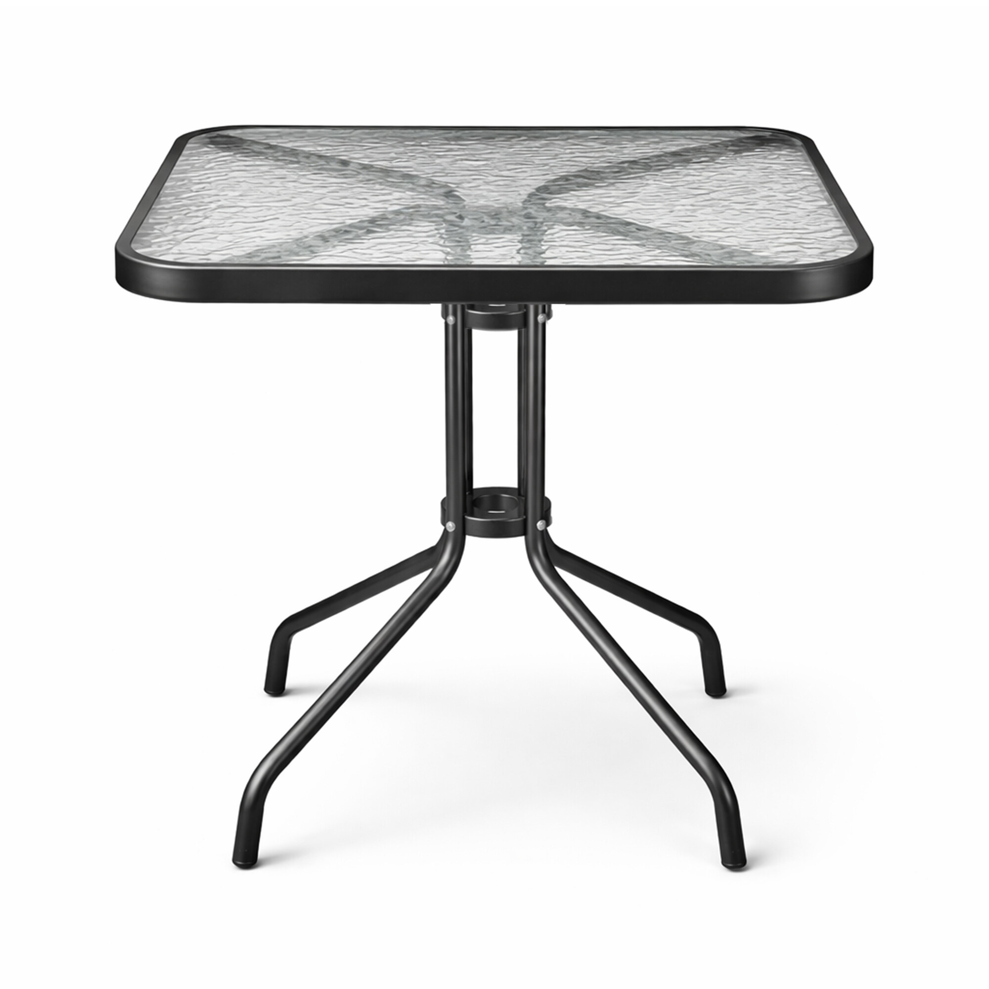 Zahradní stůl s pevným kovovým rámem a skleněnou deskou, vhodný pro zahrady, terasy, kavárny, altánky, balkóny.