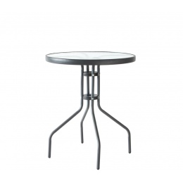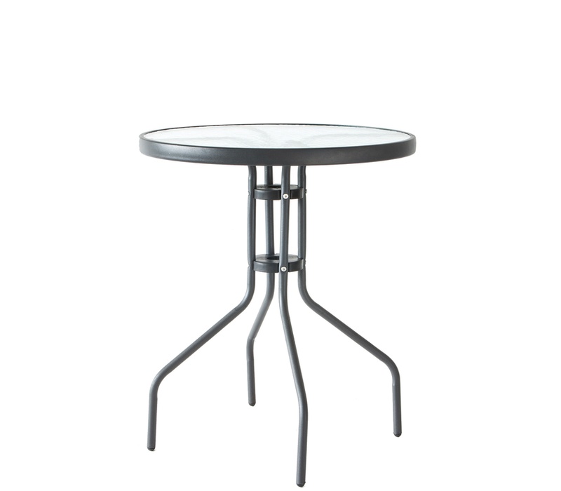 Zahradní stůl s pevným kovovým rámem a vroubkovanou skleněnou deskou v moderním designu, vhodný pro zahrady, terasy, kavárny, altánky, balkóny či pláže.