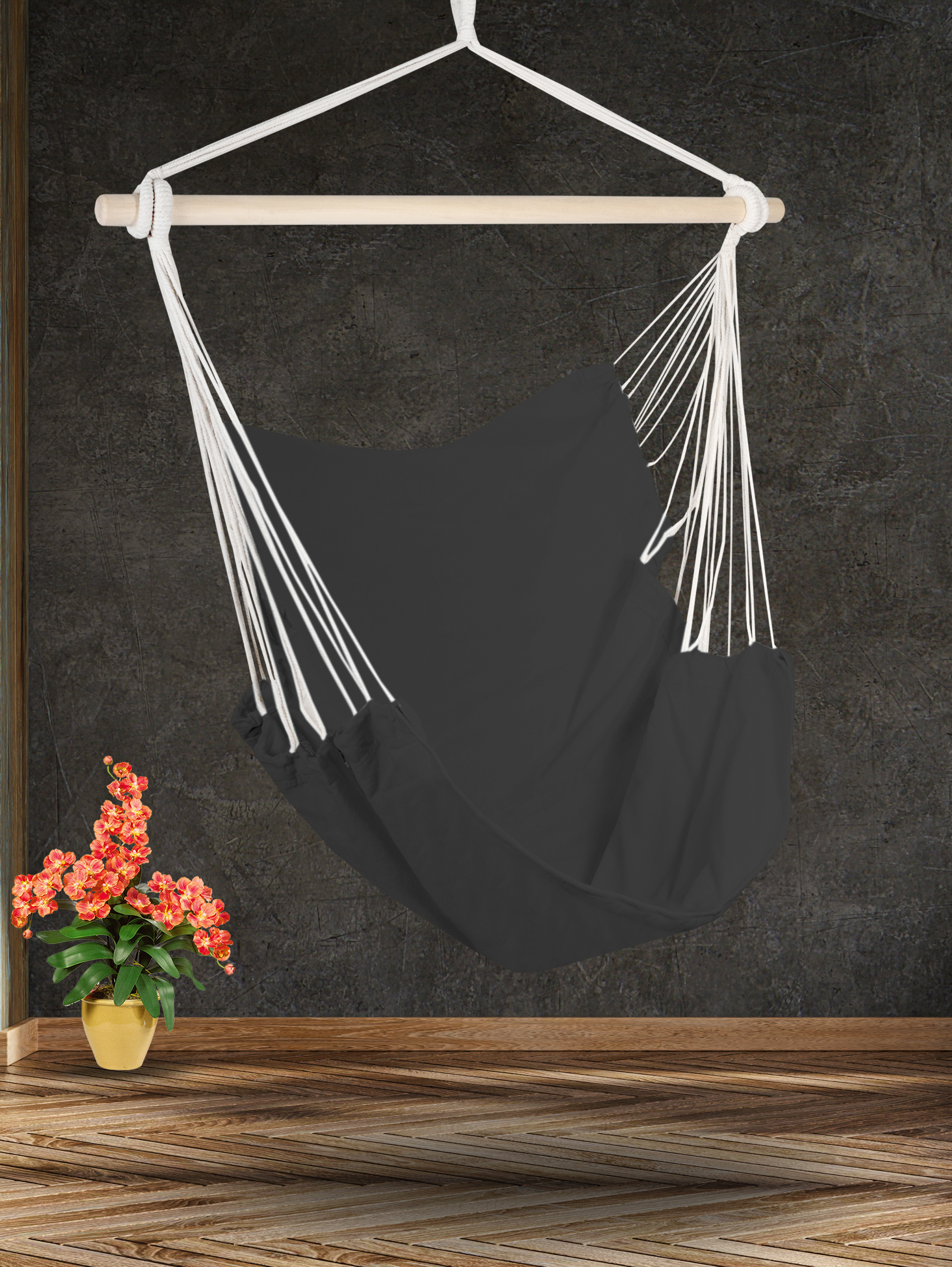 Houpací křeslo má dřevěnou příčku umožňuje pohodlné držení těla během odpočinku. Silná lana a masivní dřevo zajistí dostatečnou pevnost a nosnost až 110 kg.