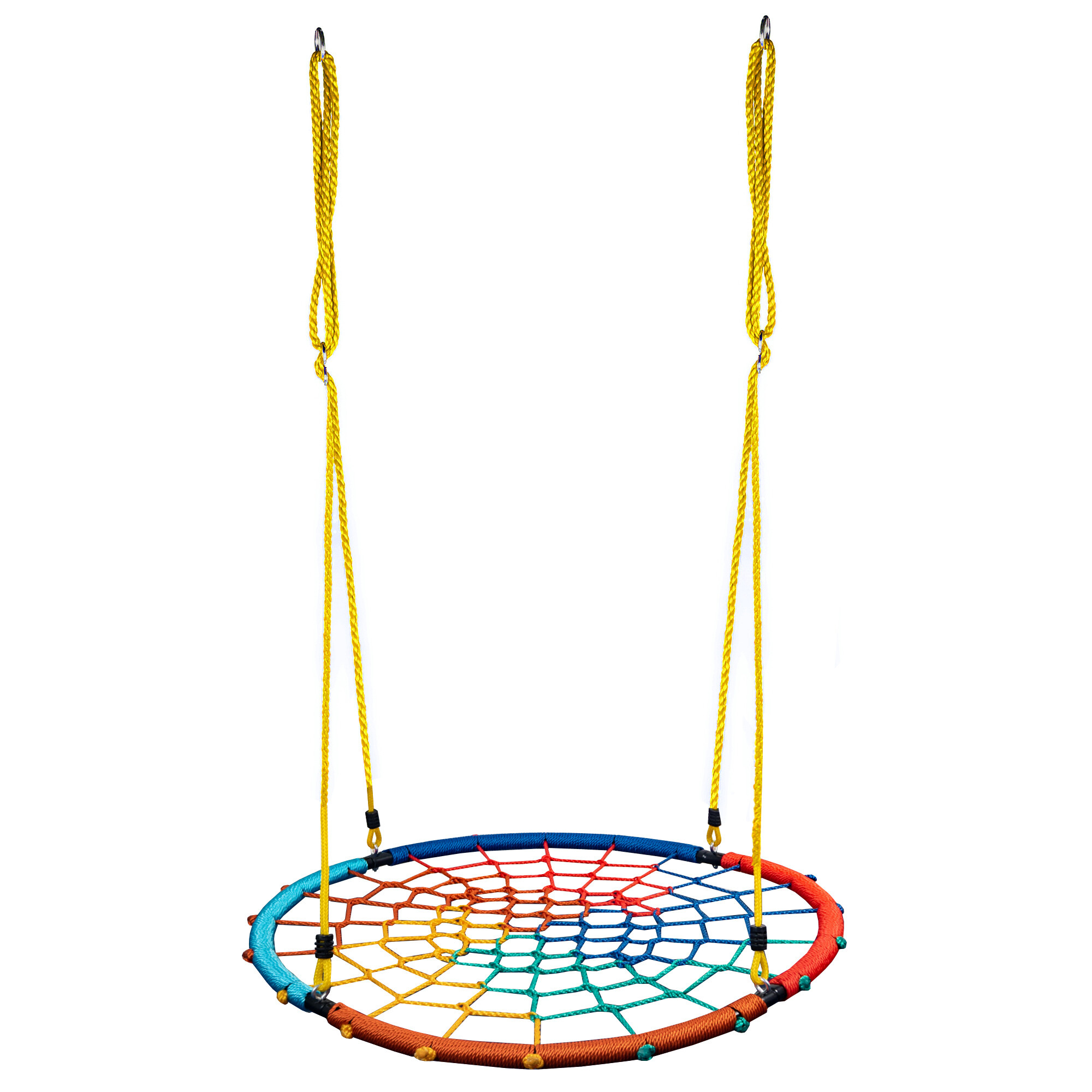 Sedák je vypletený provazovou sítí, kovový rám je rovněž chráněný provazem. Výšku houpacího kruhu lze plynule nastavit pomocí závěsných lan.