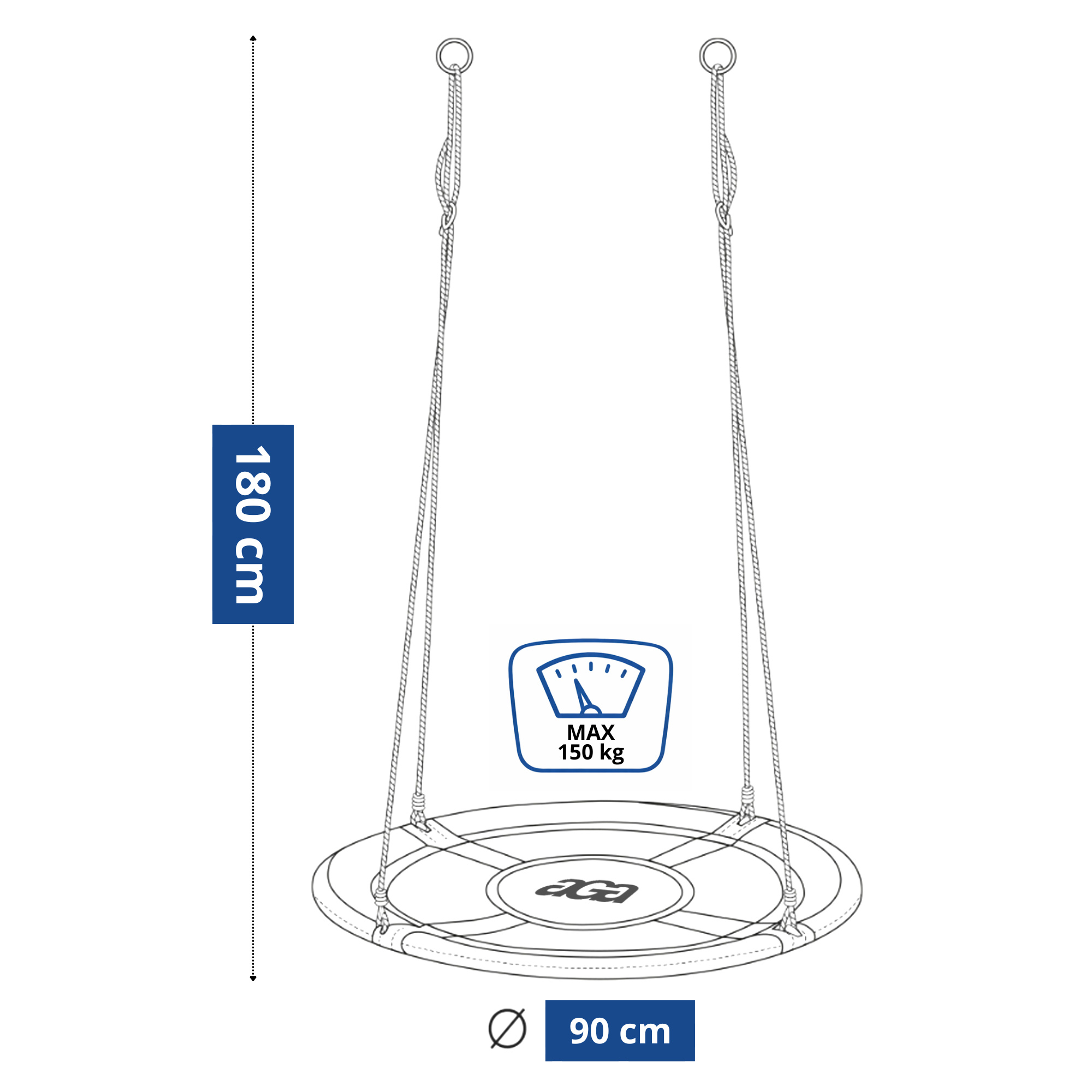 Výšku houpacího kruhu lze plynule nastavit pomocí závěsných lan.