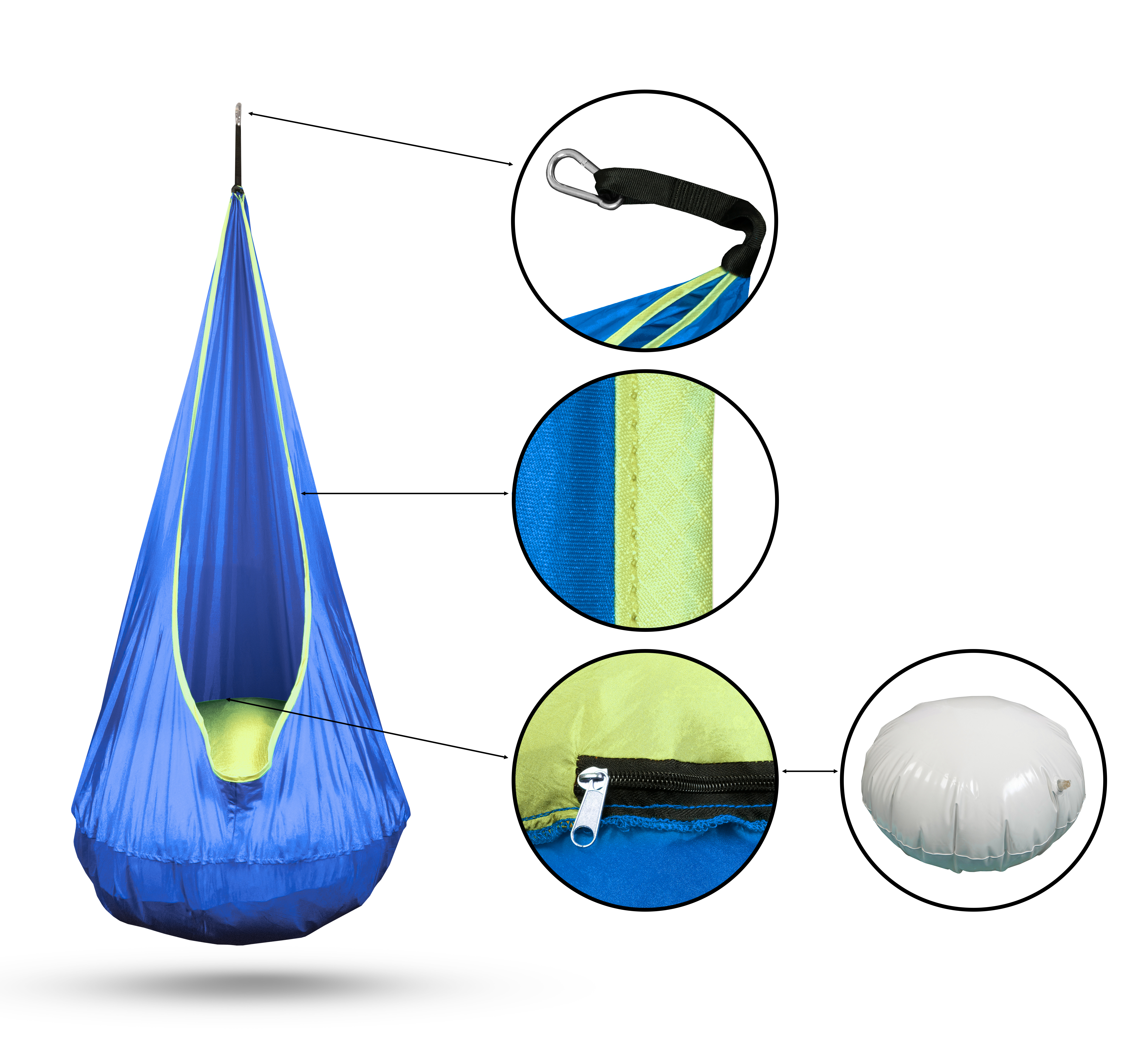 Sedací vak je určen do interiéru i exteriéru. Nevyžaduje tolik prostor jako houpačka s dvoubodovým závěsem. Dá se upevnit ke stropu, na větev i trám. Také je možno sedačku možné zavěsit i na stojan, ten ale není součástí balení.
