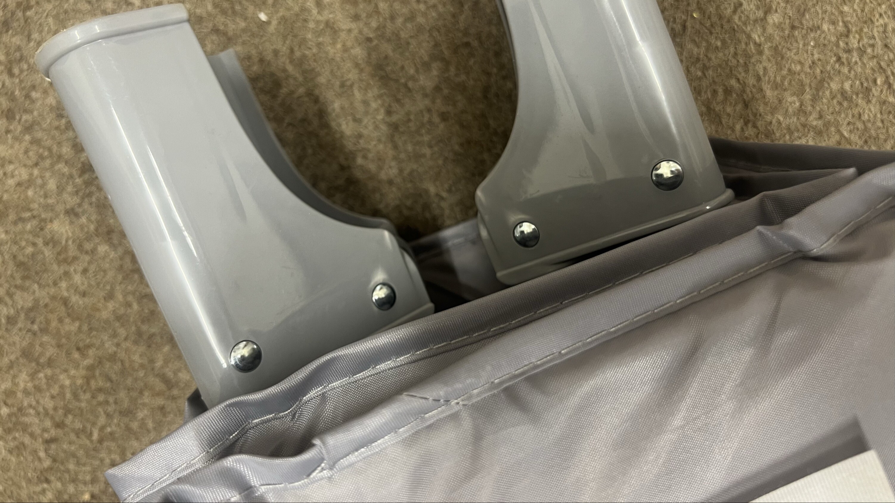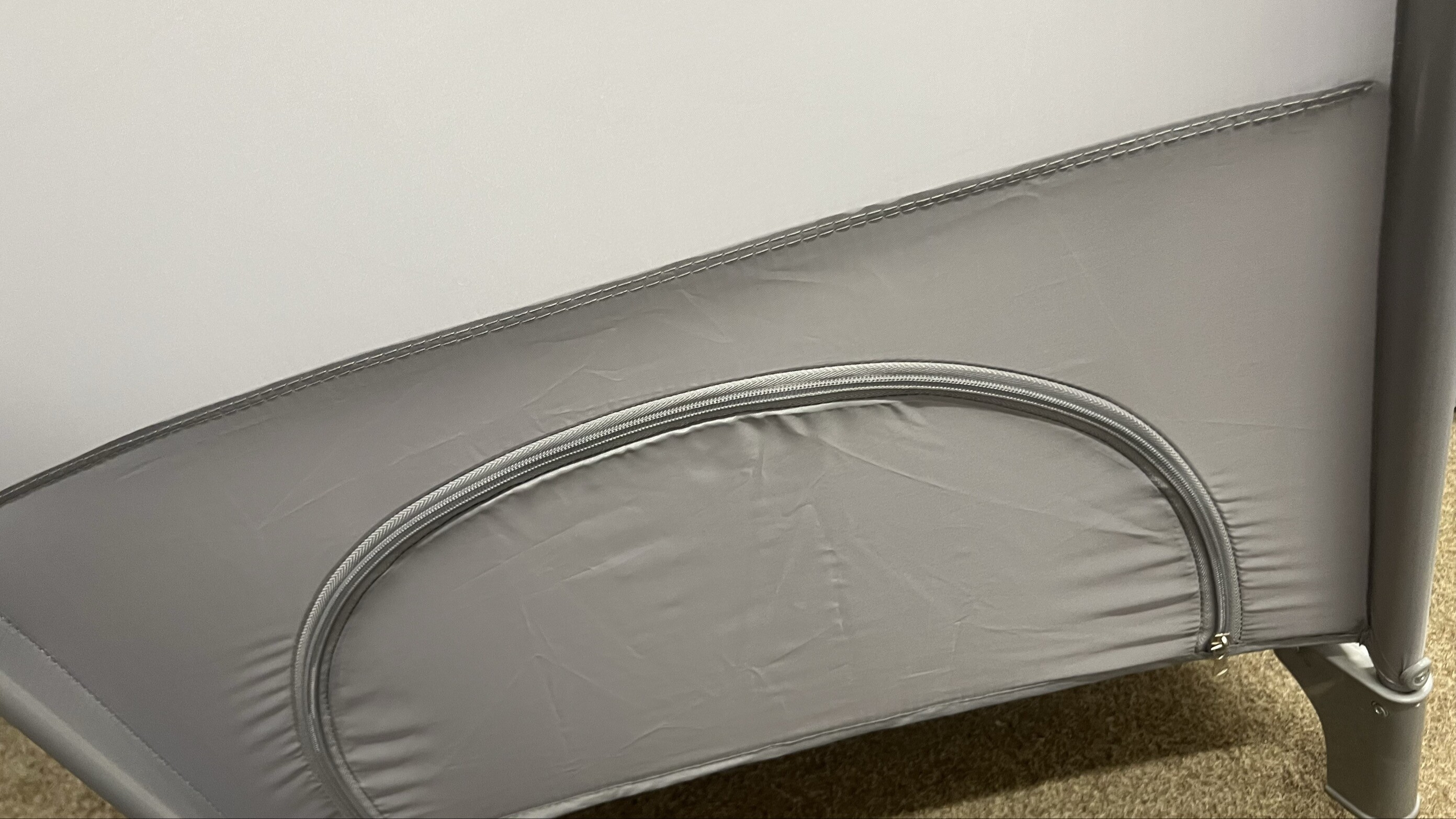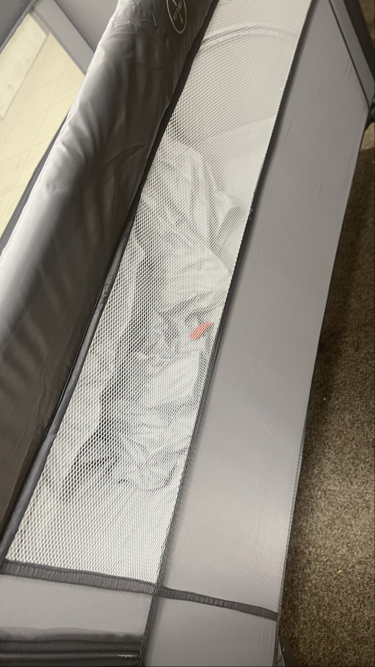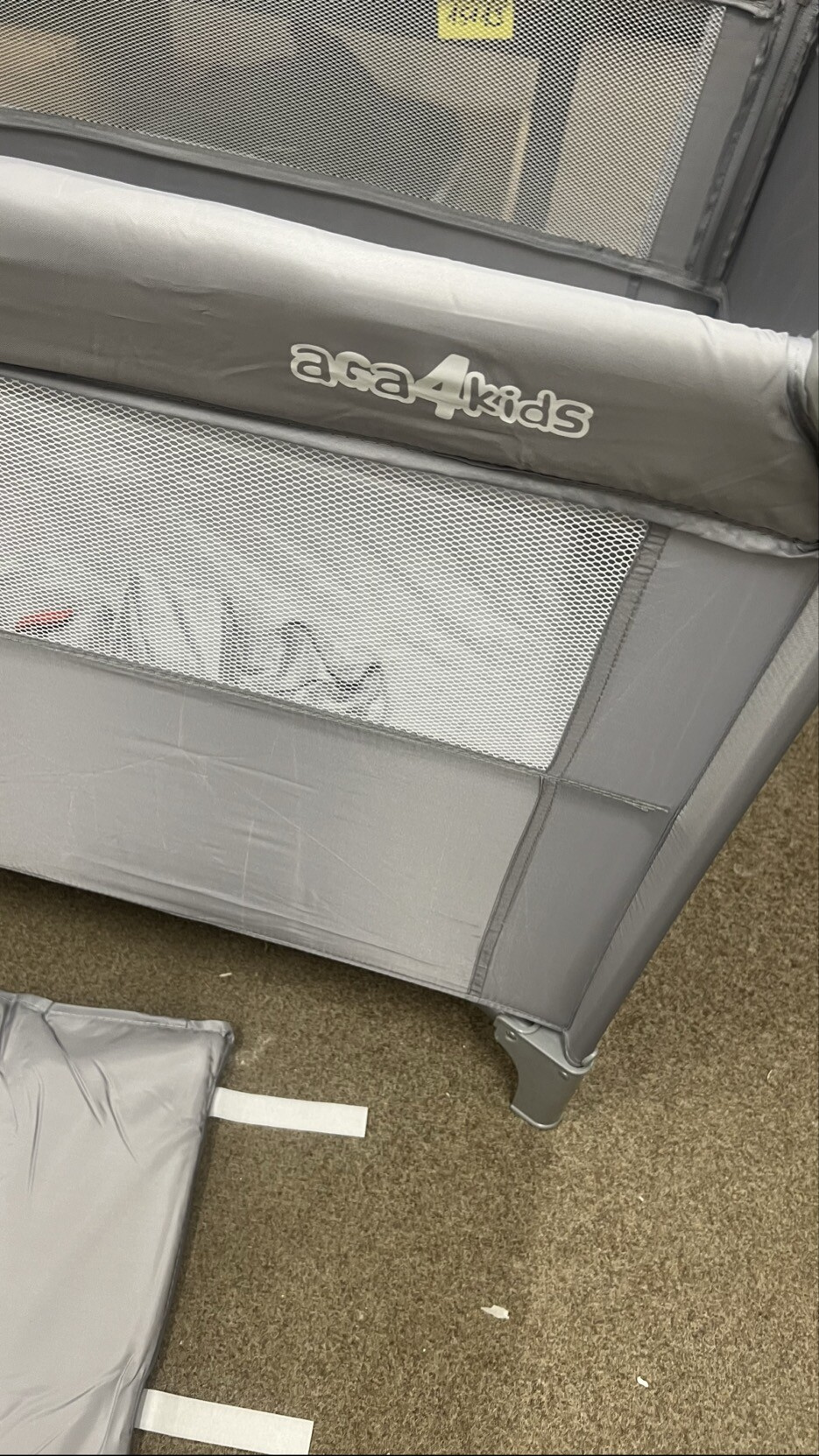 Chybí jedna ze čtyř podpůrných trubek, které slouží k vytvoření vyvýšeného patra. Pro plné využití této funkce je nutné chybějící díl nahradit jiným vhodným prvkem. Na samotnou stabilitu a bezpečné používání postýlky ve standardním režimu to však nemá vliv.