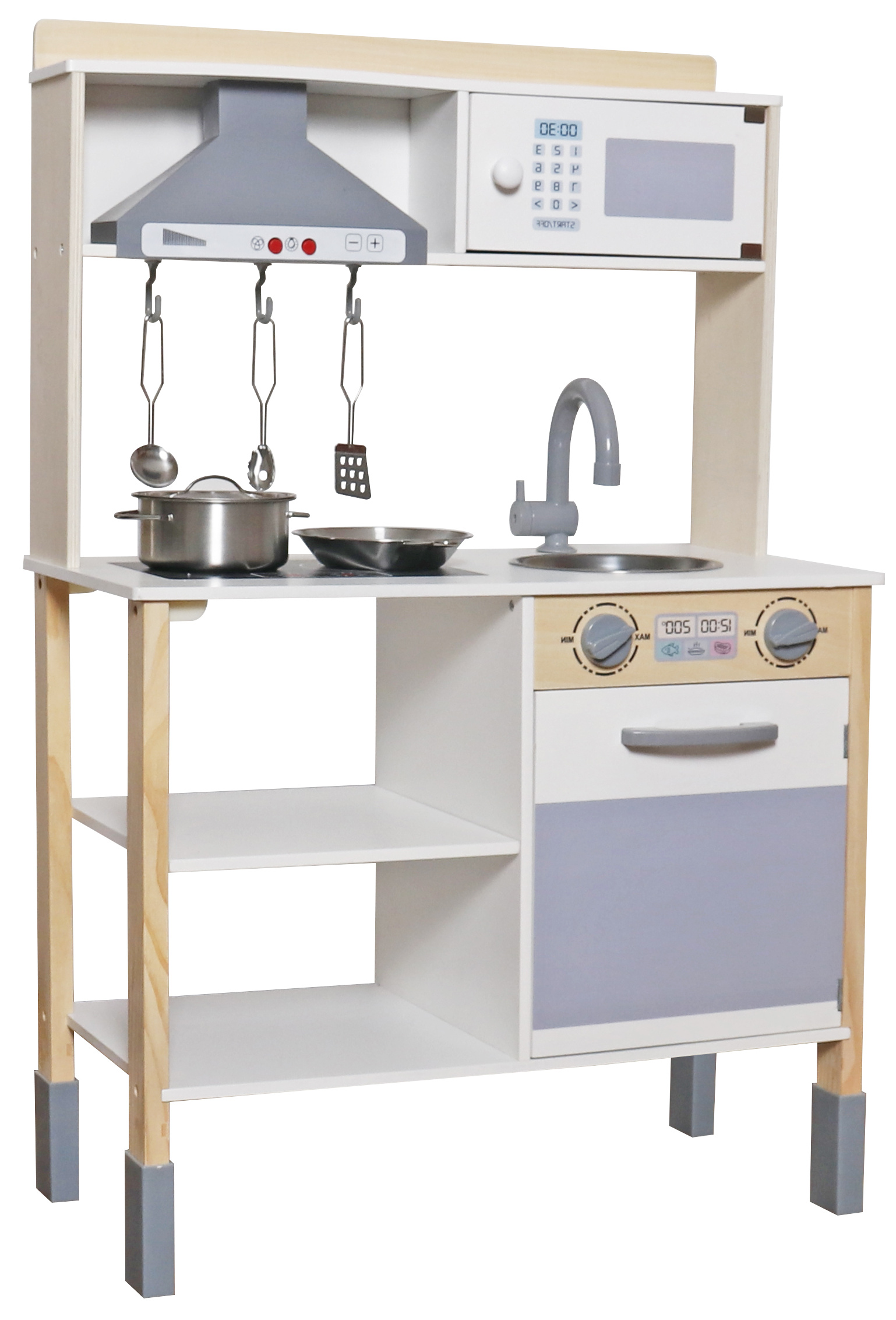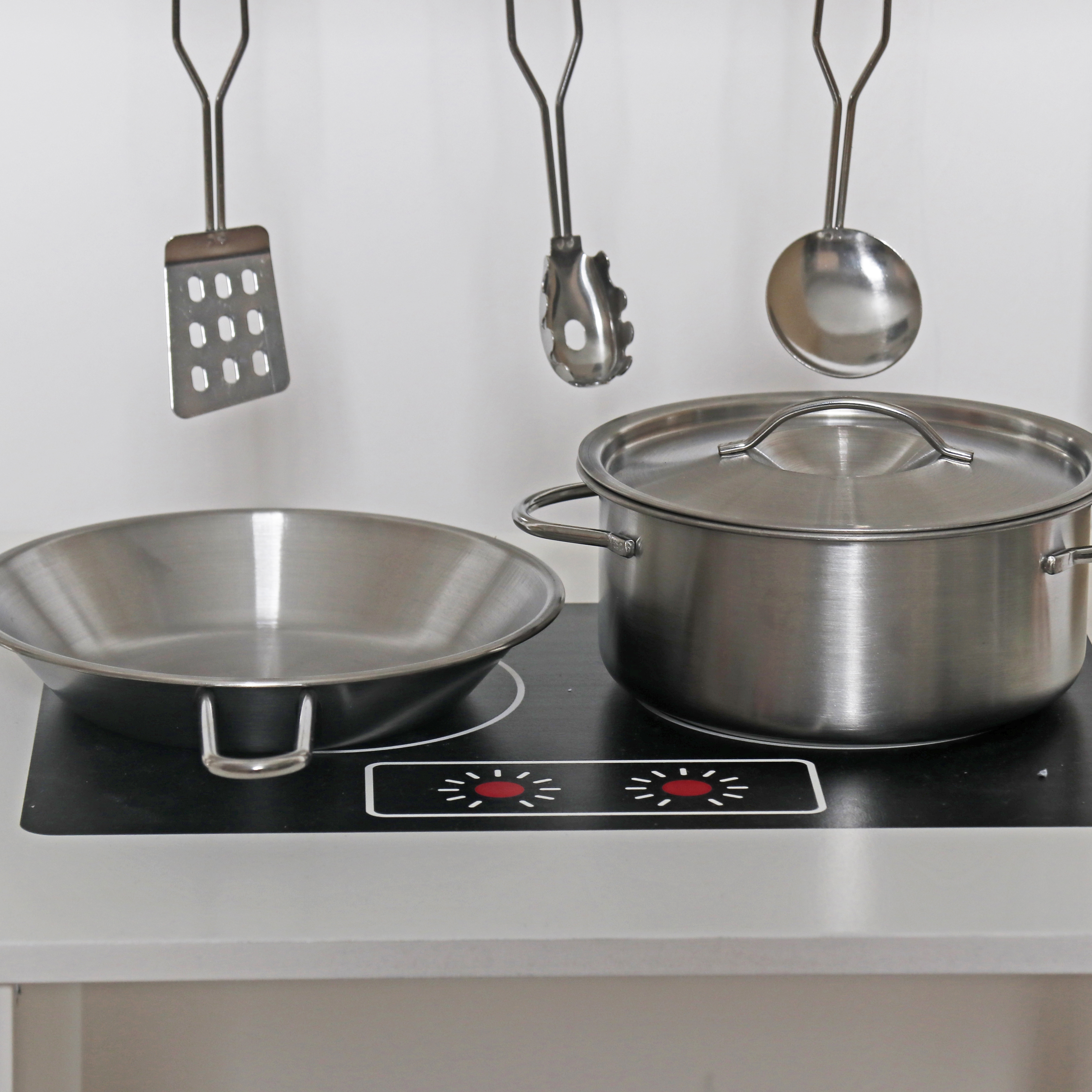Pro přípravu chutných pokrmů je dětská kuchyňka vybavena nádobím. V kuchyňce nechybí police pro uložení nádobí a háčky pro zavěšení kuchyňského náčiní.