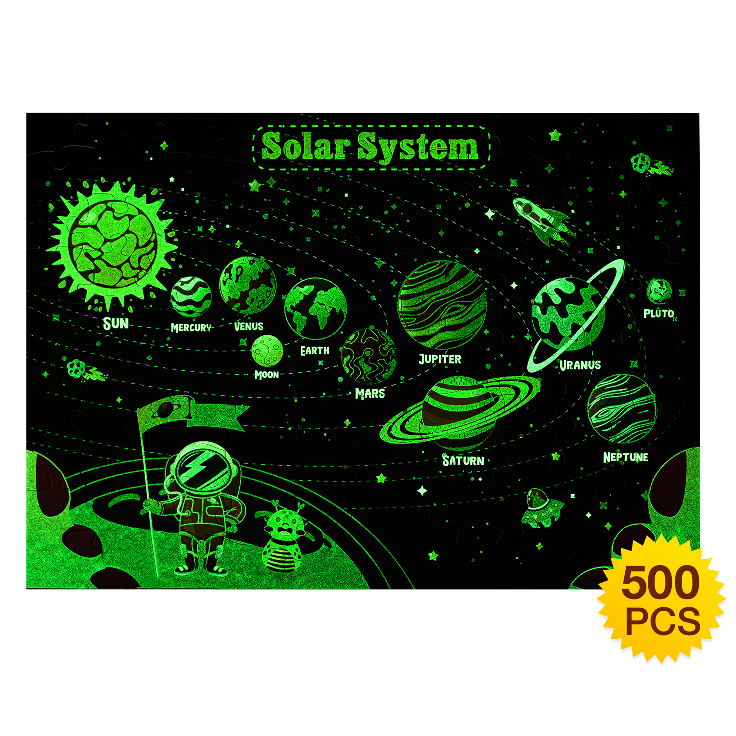 Navíc puzzle mají neonové prvky, ze kterých budou děti nadšené, po zhasnutí světla puzzle ožijí a jejich obrysy budou krásně svítit do tmy.