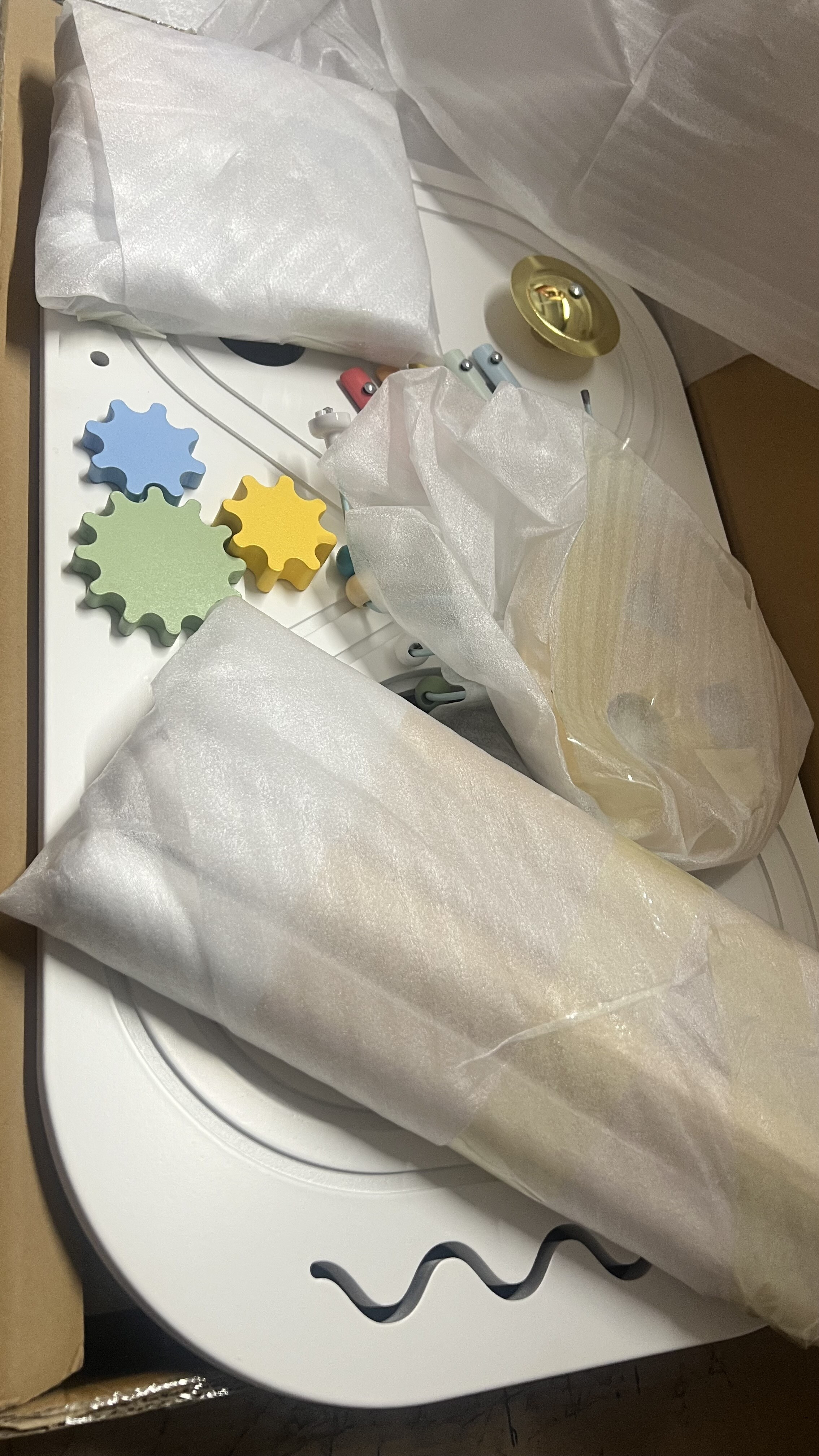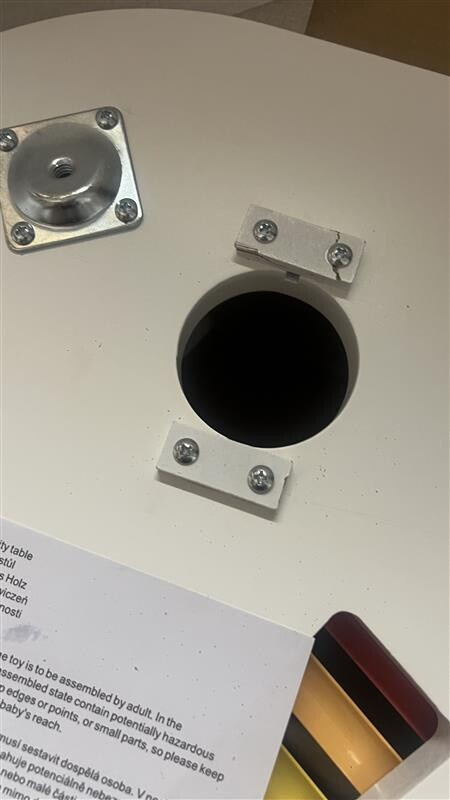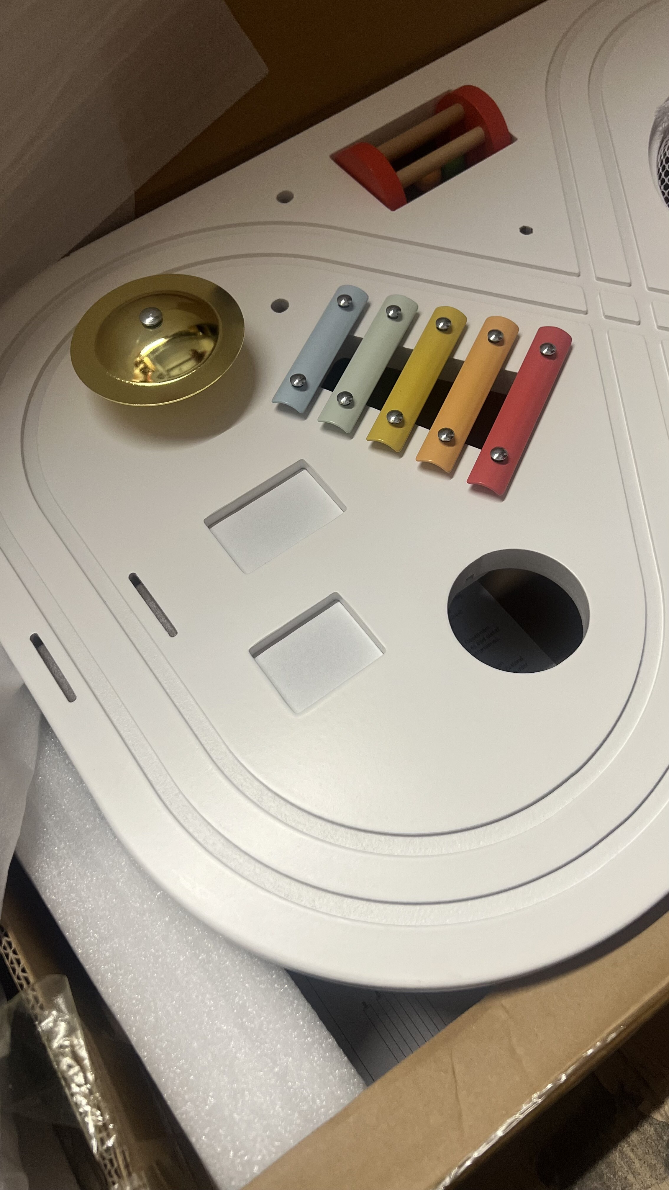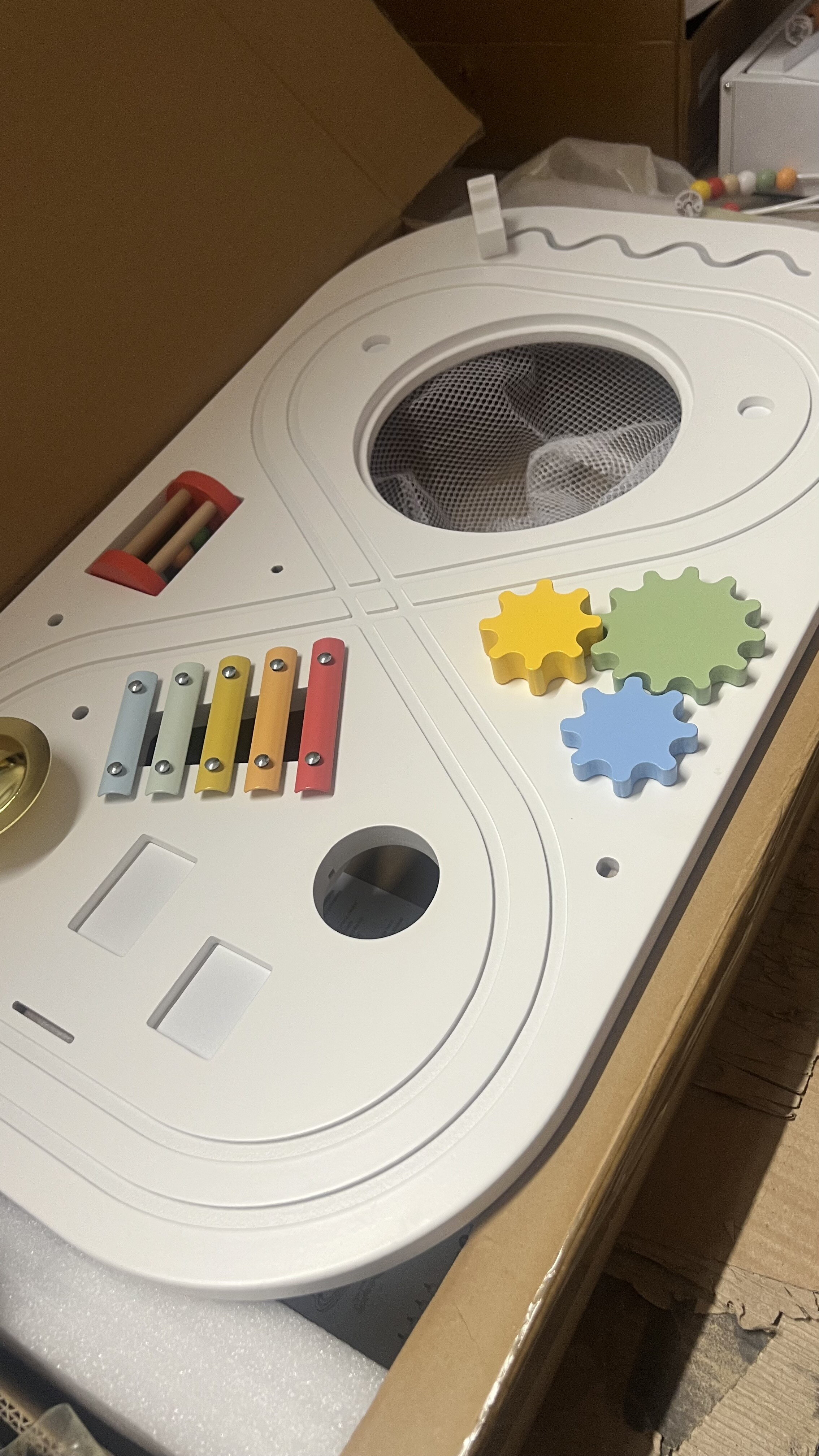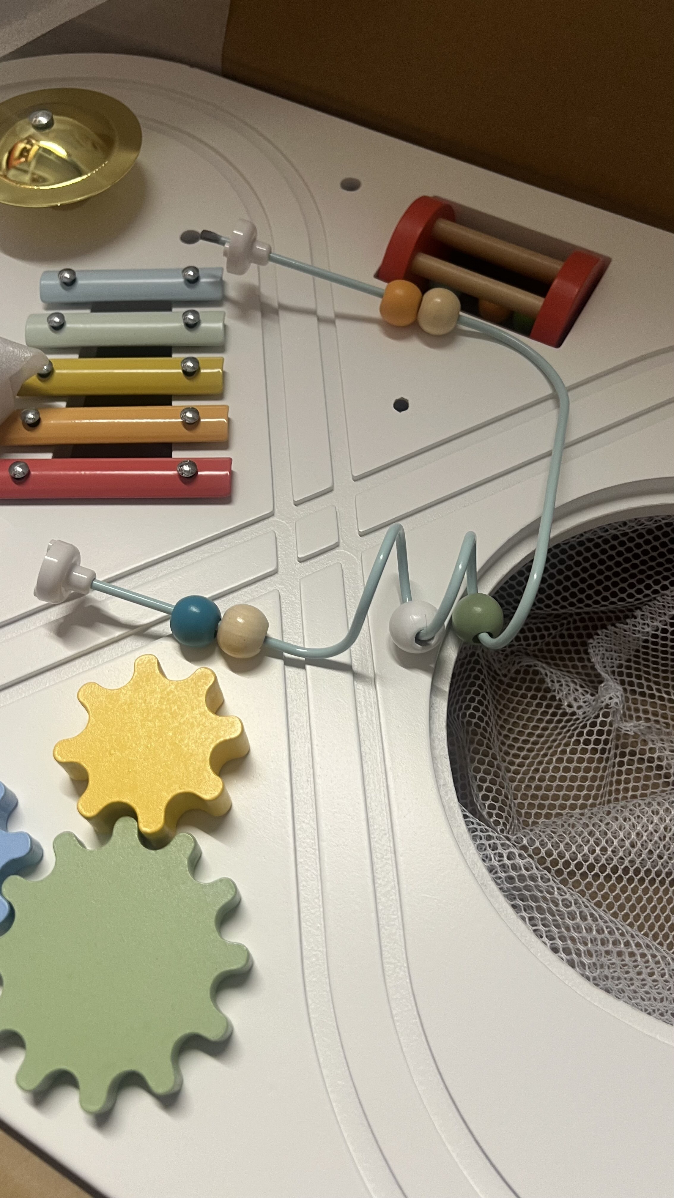 Dětský stolek je plně funkční, zařazený do kategorie 2. jakosti z důvodu chybějících dvou komponentů (míč a korálková špice).