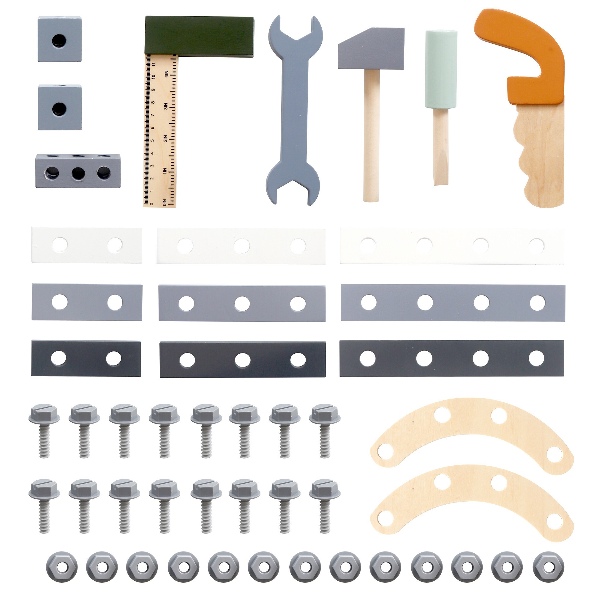 Pracovní dílna obsahuje vše, co malý kutil potřebuje - kladívko, šroubovák, pilka, šroubky, klíč, matice, svěrák a další příslušenství.