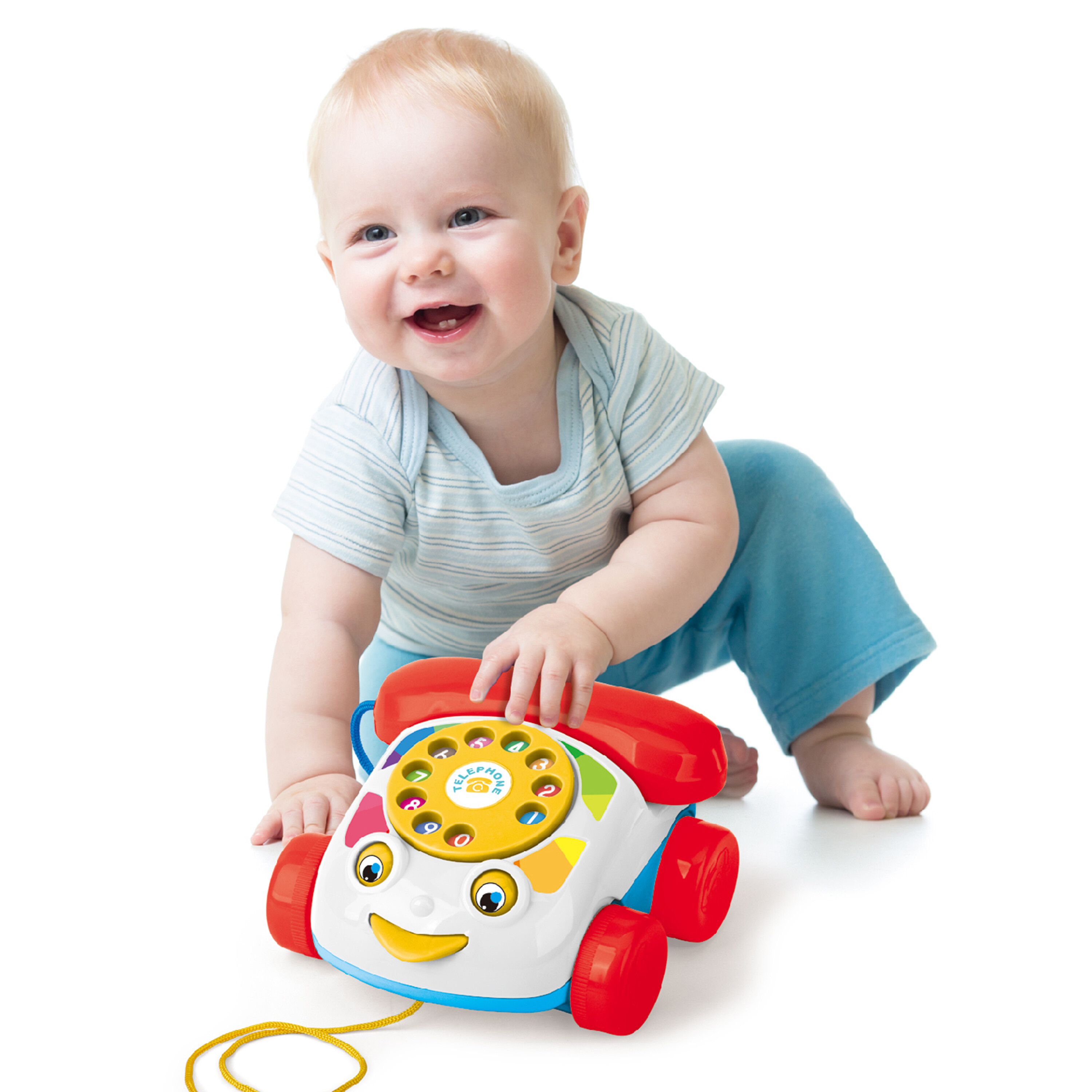 Veselé barvy, zábavné zvuky a pohyblivé očka a jazyk vybízejí děťátko ke tažení telefonu a tím ke chůzi.