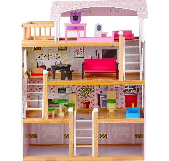 Domeček má tři úrovně pater se schodištěm, různě laděné pokoje s nábytkem, který je speciálně uzpůsobený pro velké panenky.