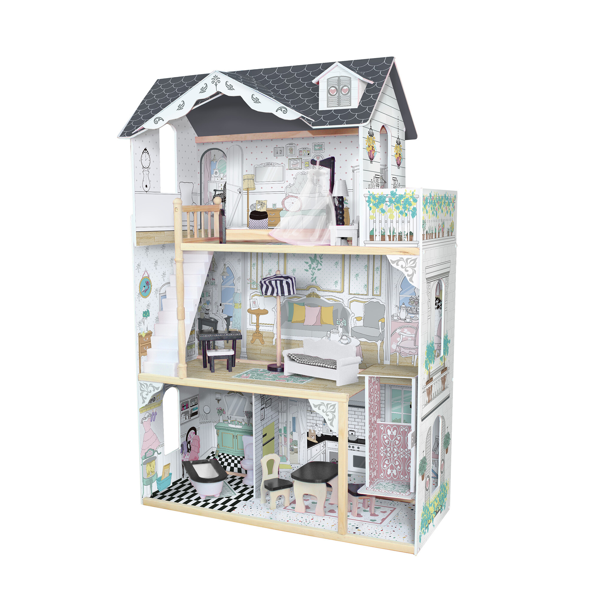 Třípatrový velký dřevěný domeček. V domečku jsou čtyři pokoje, které jsou zařízeny a vyzdobeny každý v jiném stylu.
