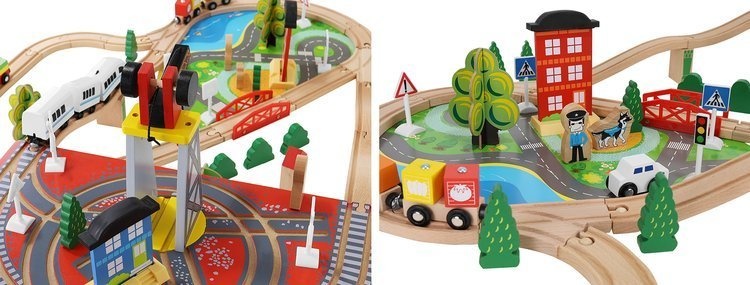 - Sada obsahuje - části kolejnic s mostem, nákladní vlak, osobní vlak, auto, sada stromů a značek, 3 muži a policejní pes, překládací přístav s jeřábem a deska s autem