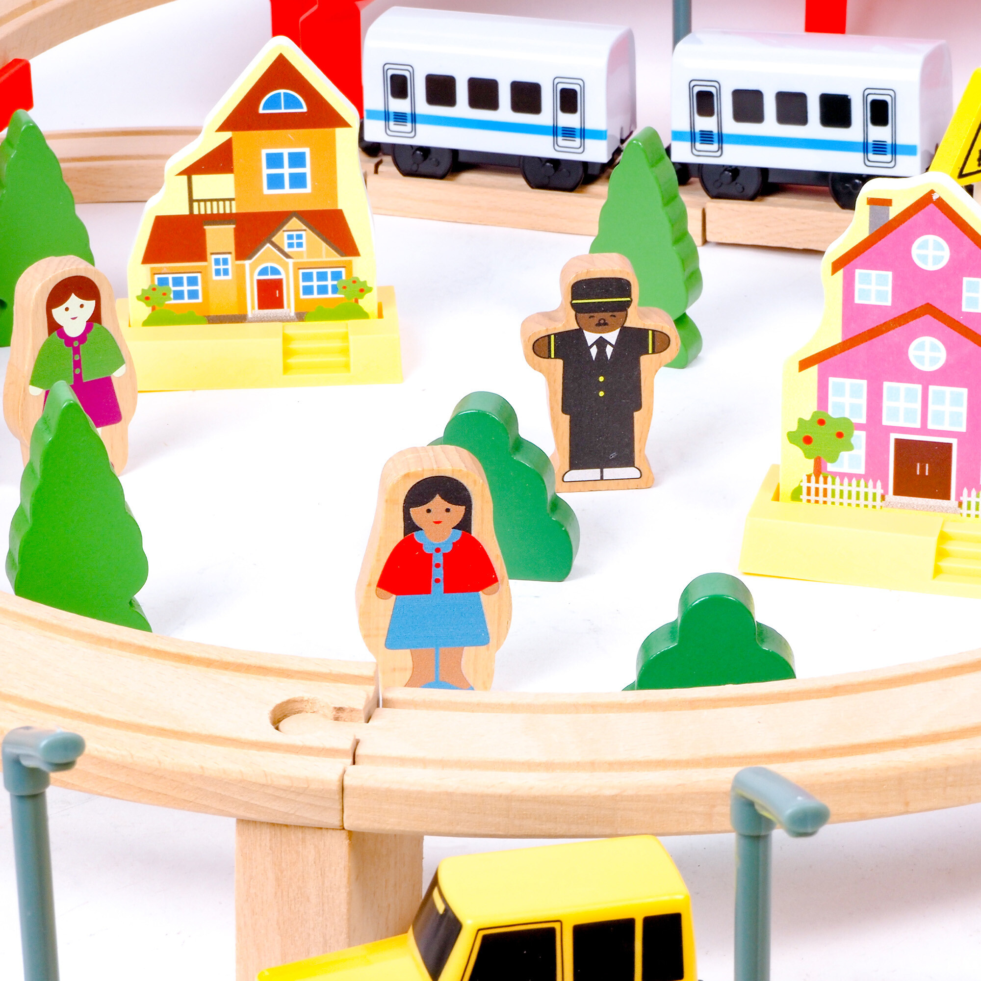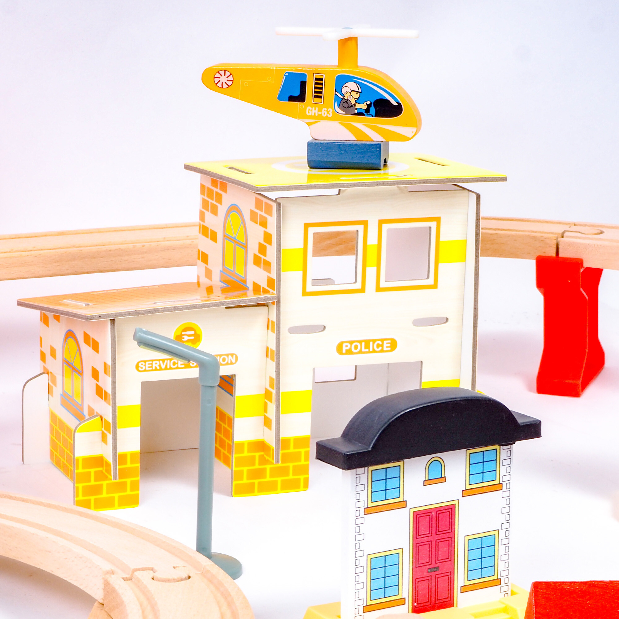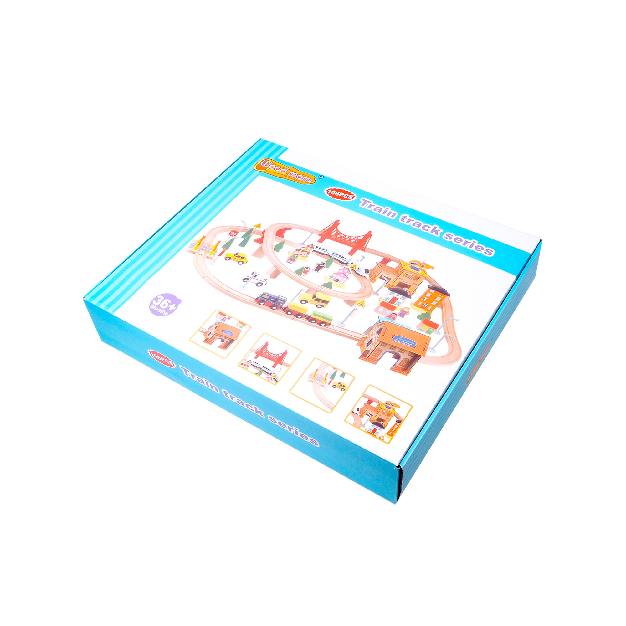 - Sada obsahuje - části kolejnic s mostem, vlaky, lokomotiva, vagóny, přejezd, zastávka, auta, budovy, figurky, dopravní značky, vrtulník a stromy
