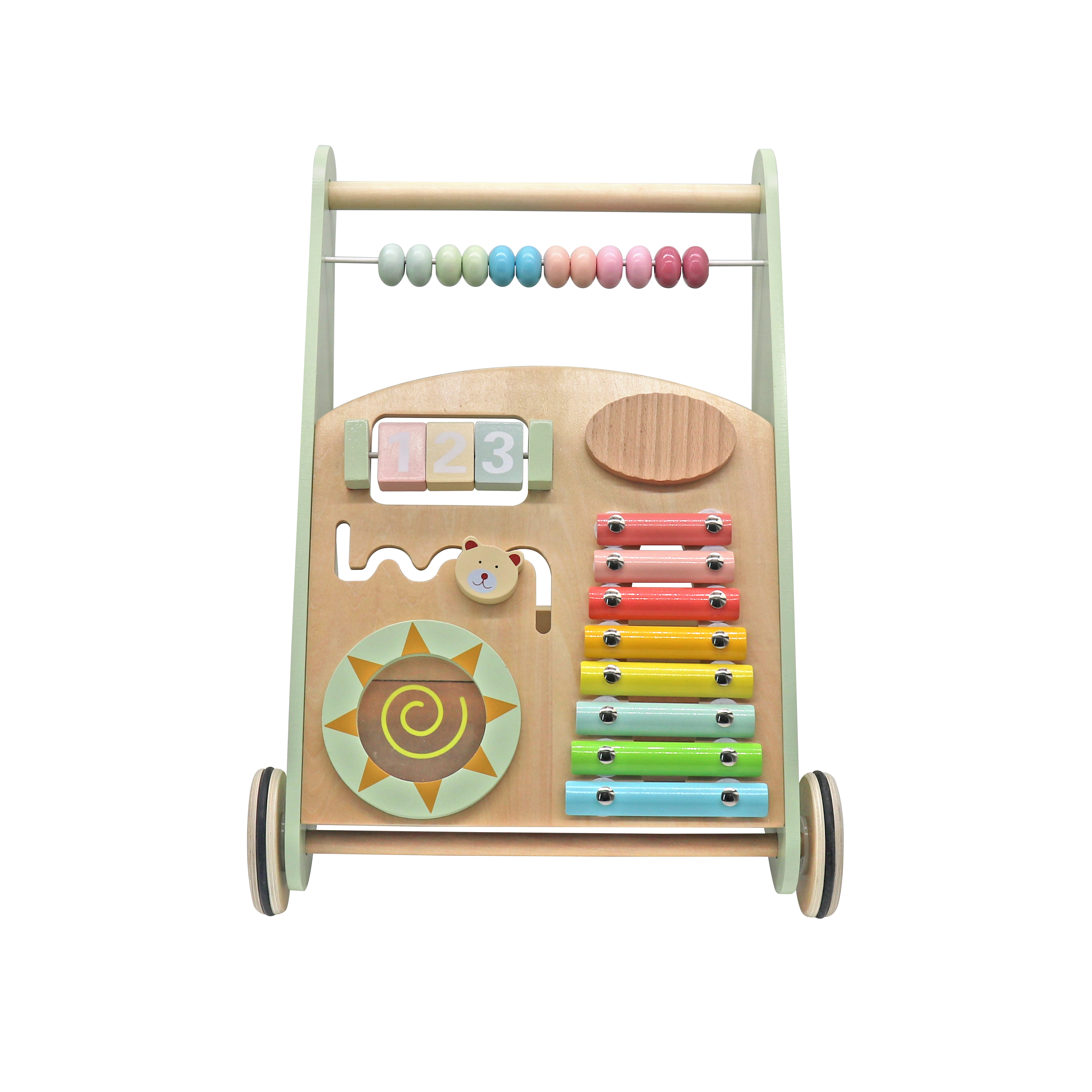 Multifunkční chodítko je kombinací mnoha vzdělávacích hraček v jednom. Chodítko je vyrobeno z vysoce kvalitního dřeva bez nebezpečných (ostrých) prvků. Chodítko dítěti pomáhá i s prvními krůčky.