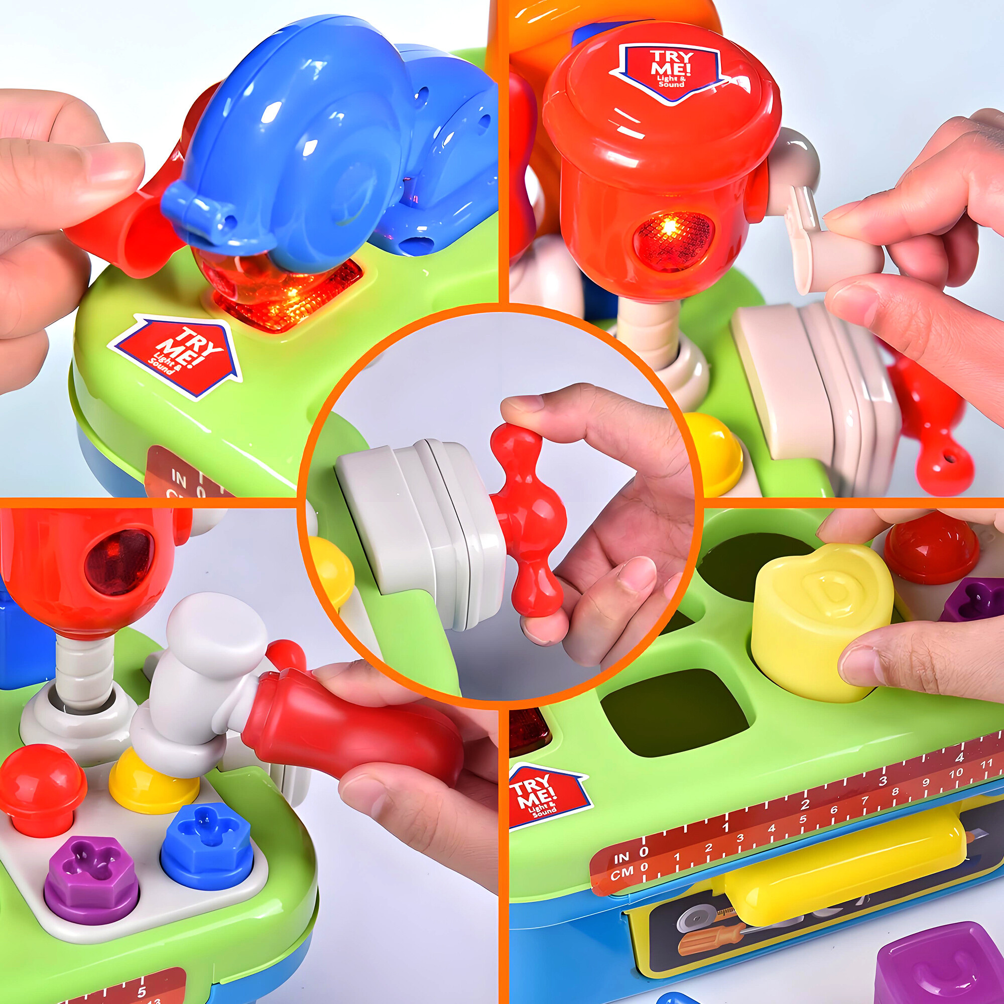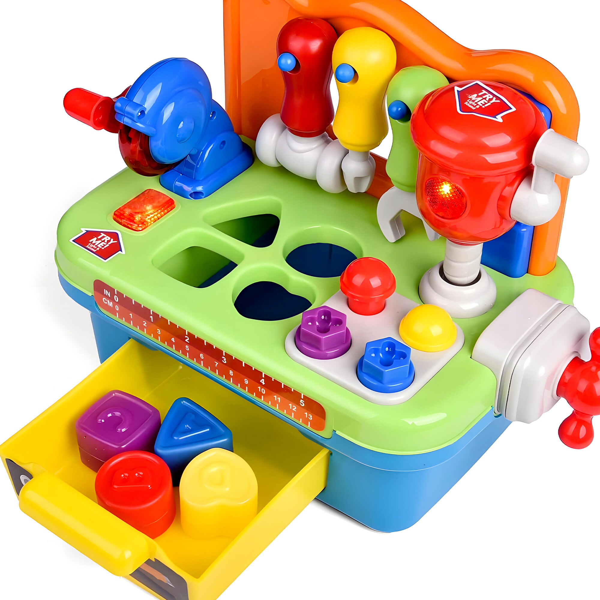 Ve výbavě najděte otočnou pilu a vrtačku se světlem a zvukem, svěrák, výsuvnou přihrádku a další nářadí. Dále je stoleček vybavený prohazovacími otvory kterými lze vhazovat přiložené barevné kostky.