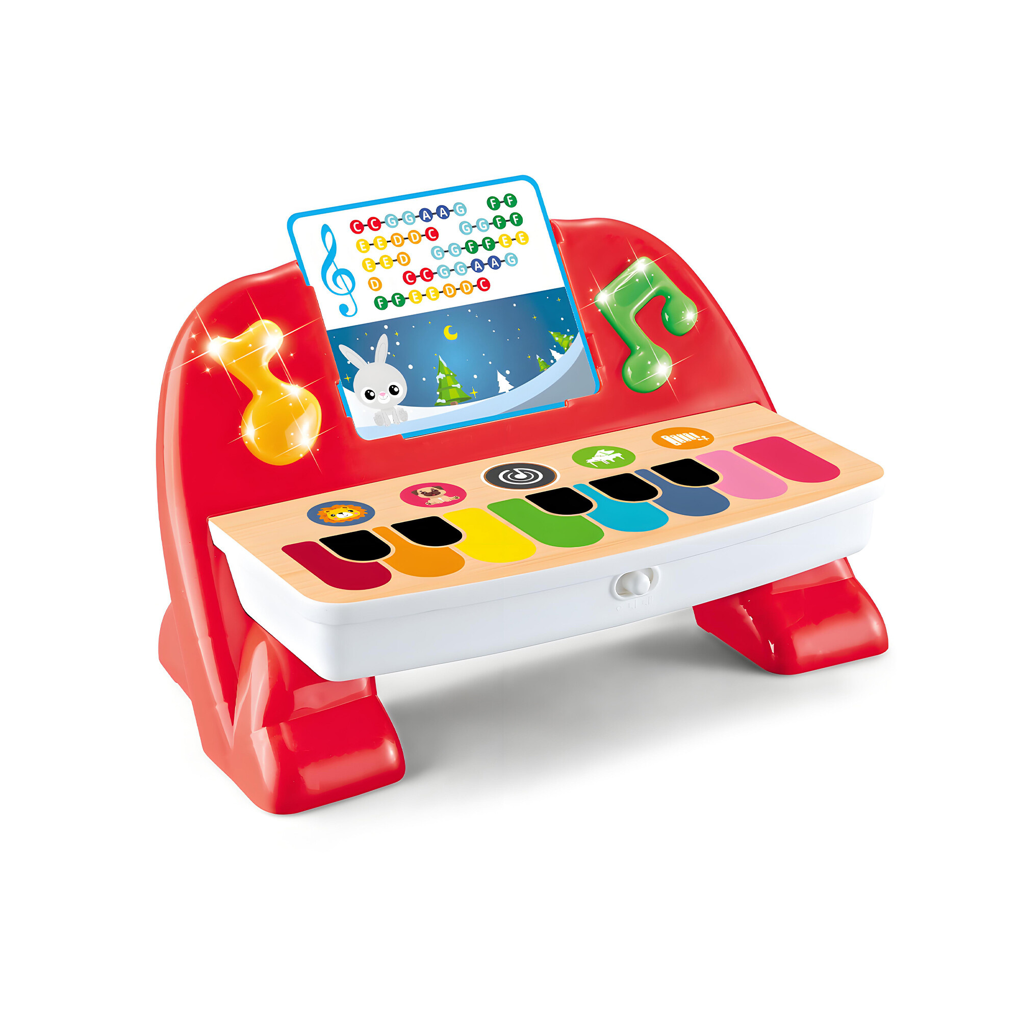 Piano má osm kláves nabízí dostatek prostoru pro experimentování s melodiemi a rytmy. Dítě může objevovat různé tóny a vytvářet si vlastní hudební kompozice.