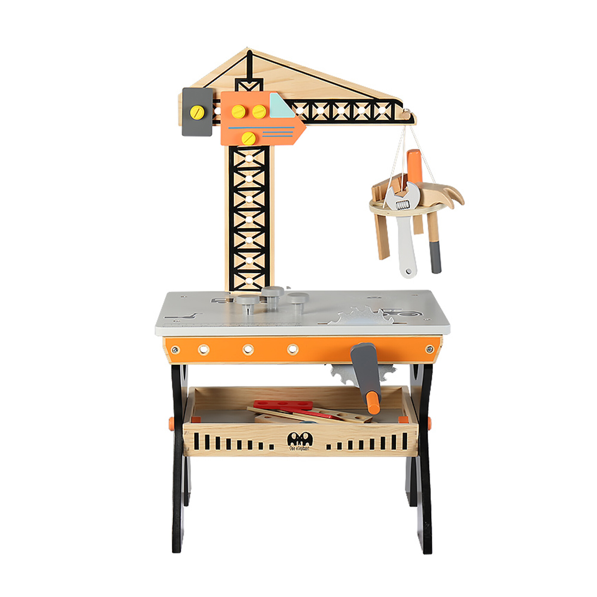 Pracovní dílna obsahuje vše, co malý kutil potřebuje - kladívko, šroubovák, šroubky, nastavitelný klíč, matice, pila, vodováha a další příslušenství.