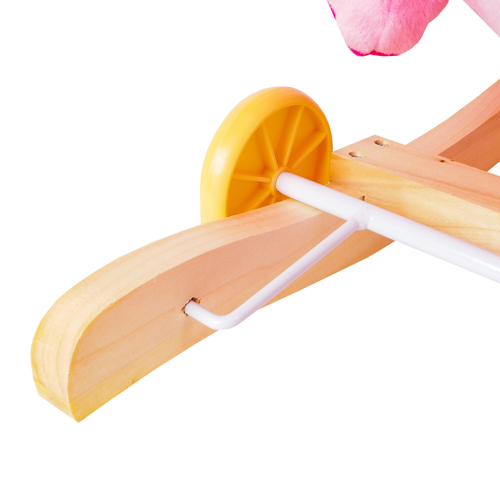 Pevné dřevěné lišty a rukojeti pomáhají dítěti udržet rovnováhu. Překlopením jednoduchého mechanismu na lištách vysunete kolečka, čímž ve vteřině změníte houpací hračku v jezdícího koníka.