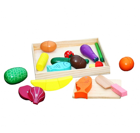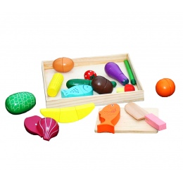 - Set potravin obsahuje, dřevěný nůž, dřevěné prkénko na krájení, napodobeniny ovoce, zeleniny a ryby