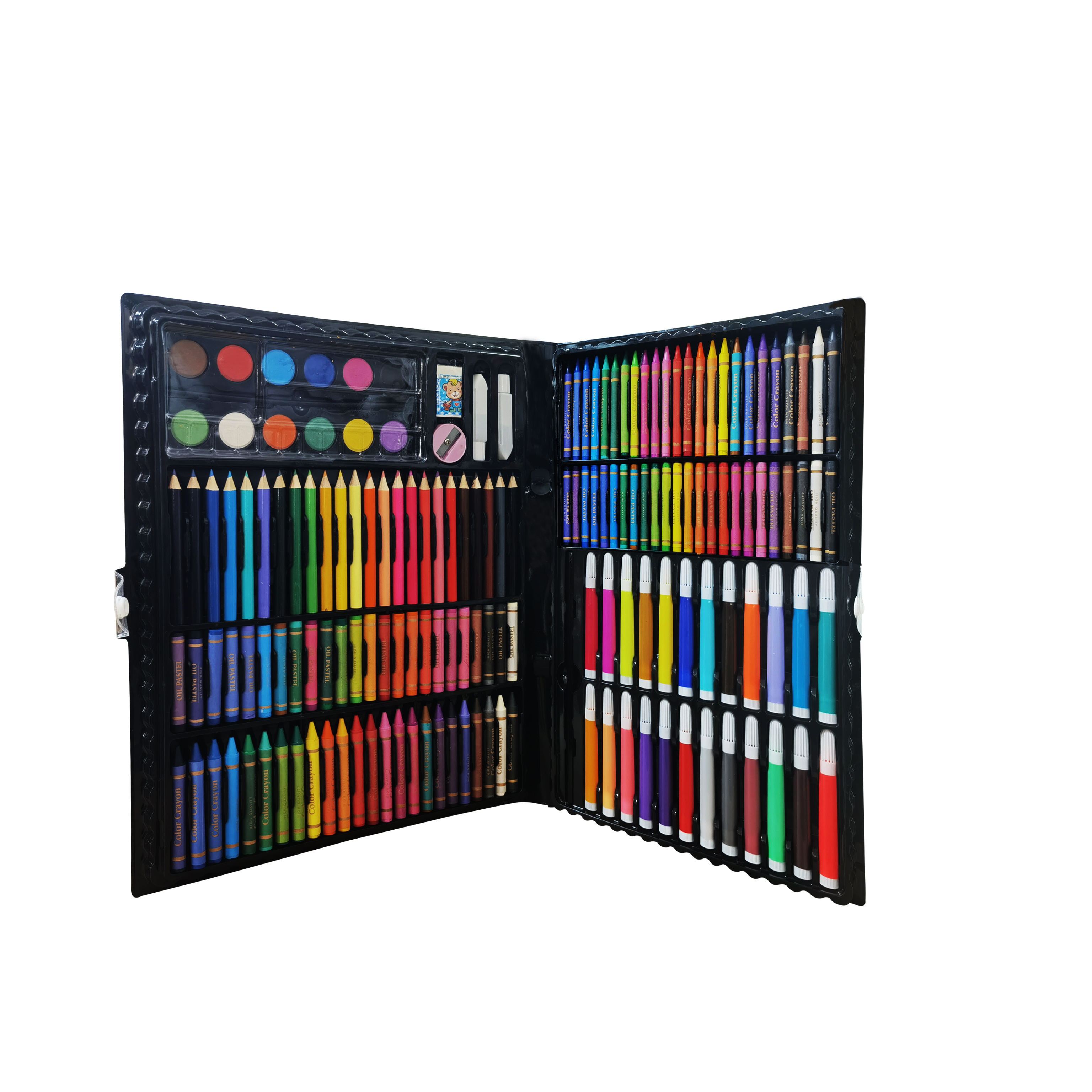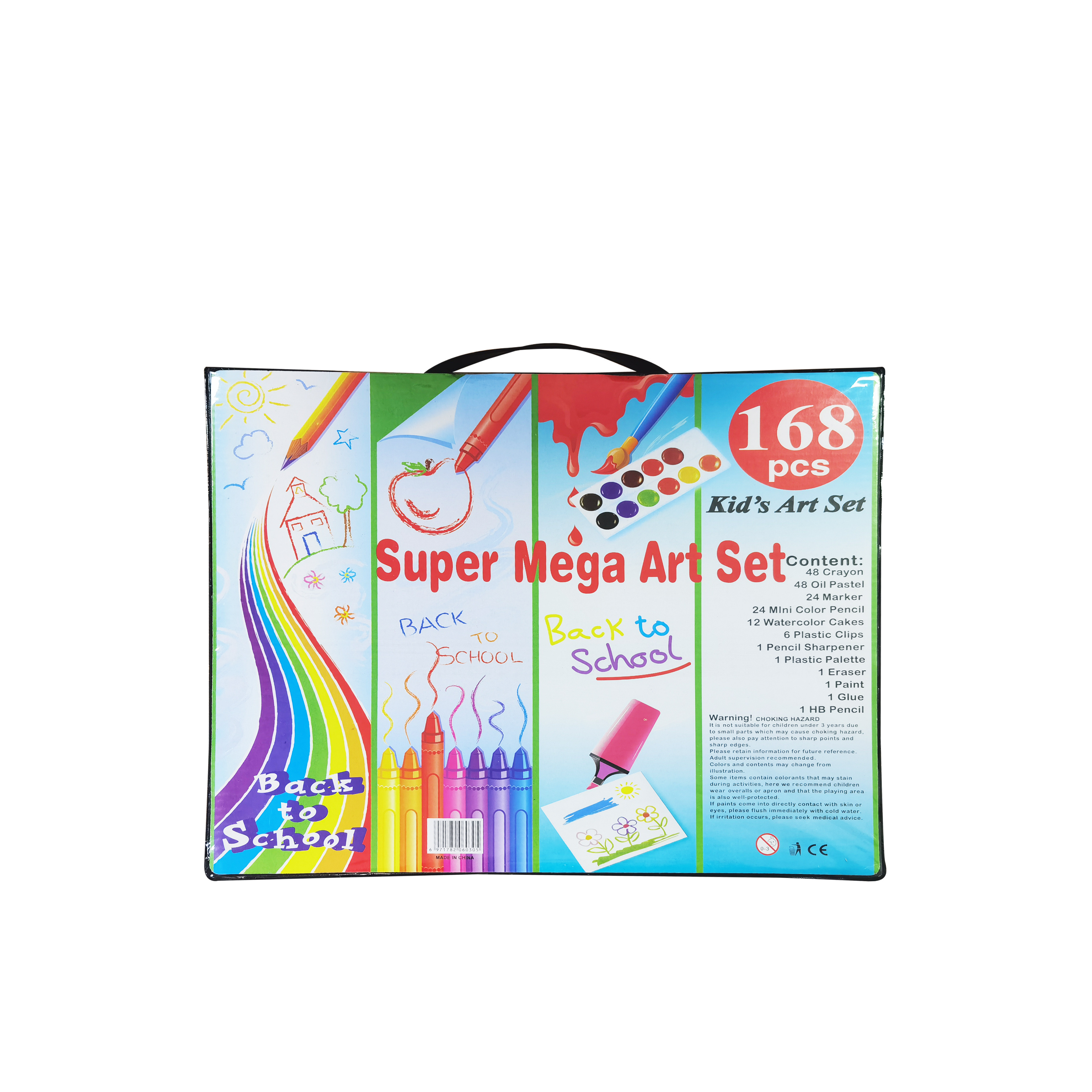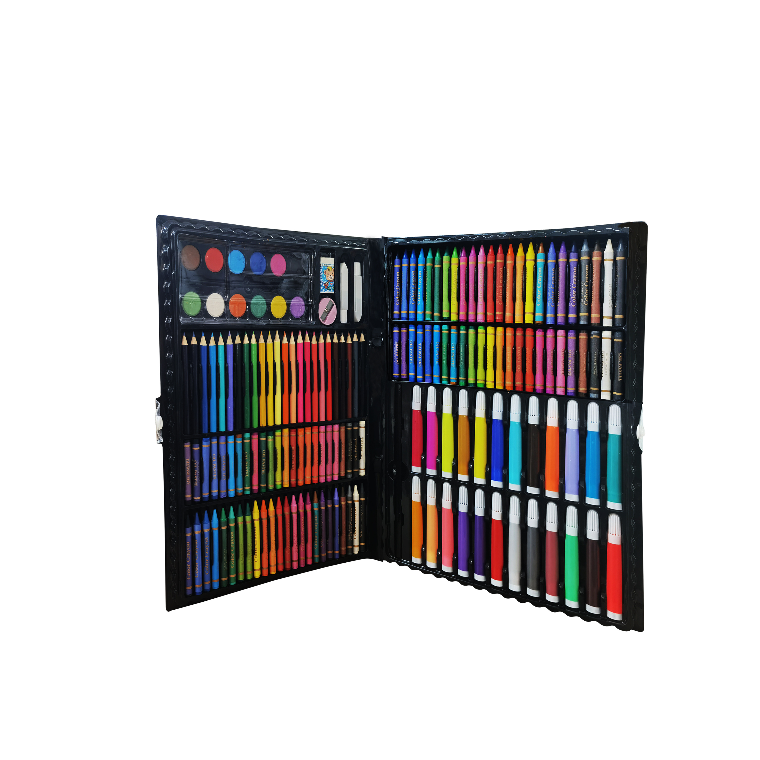 12 vodových barev, 48 olejových pastelů, 48 voskových pastelů, 24 pastelek, 24 fixů, gumu, štětec, korektor, lepidlo, 5 listů pro malování.