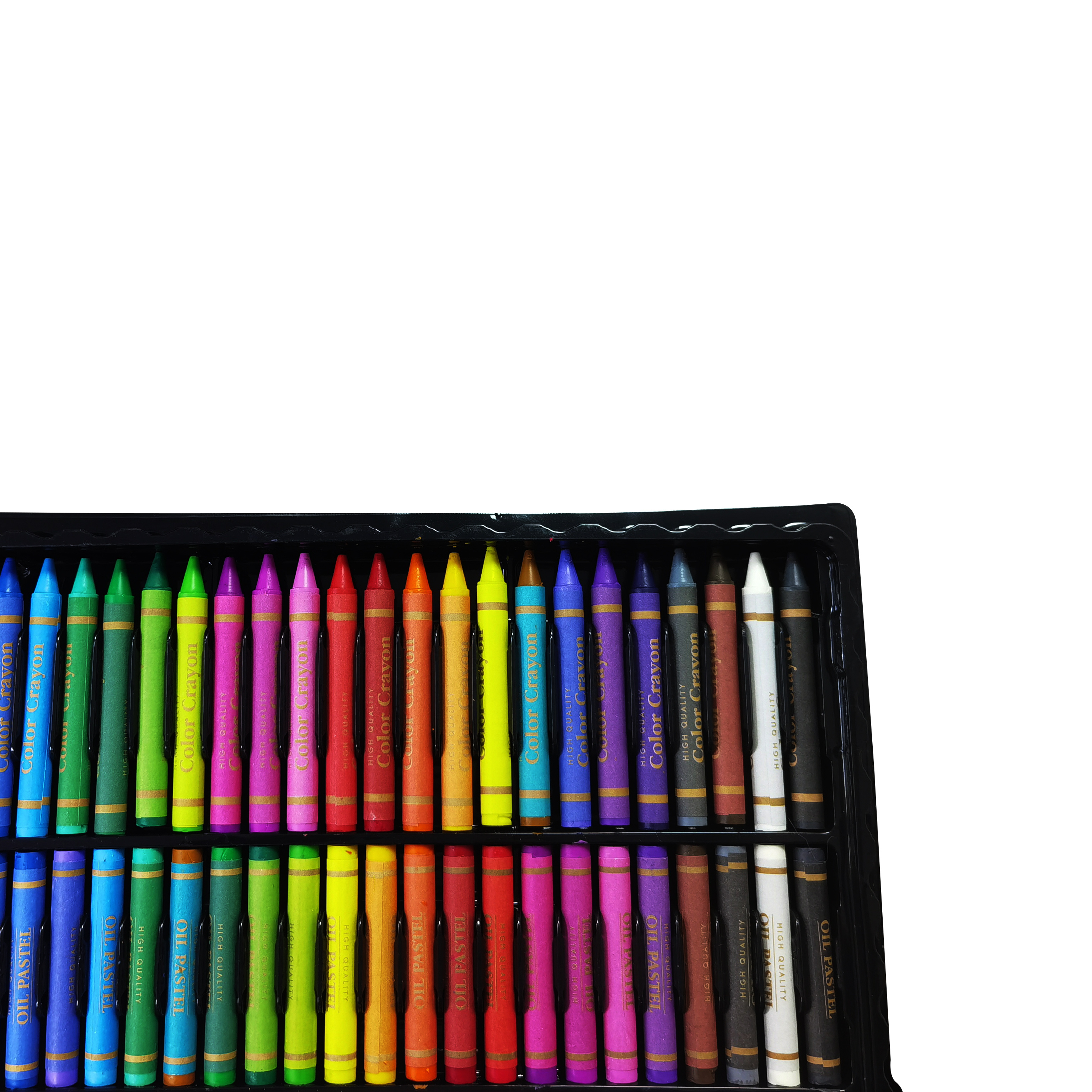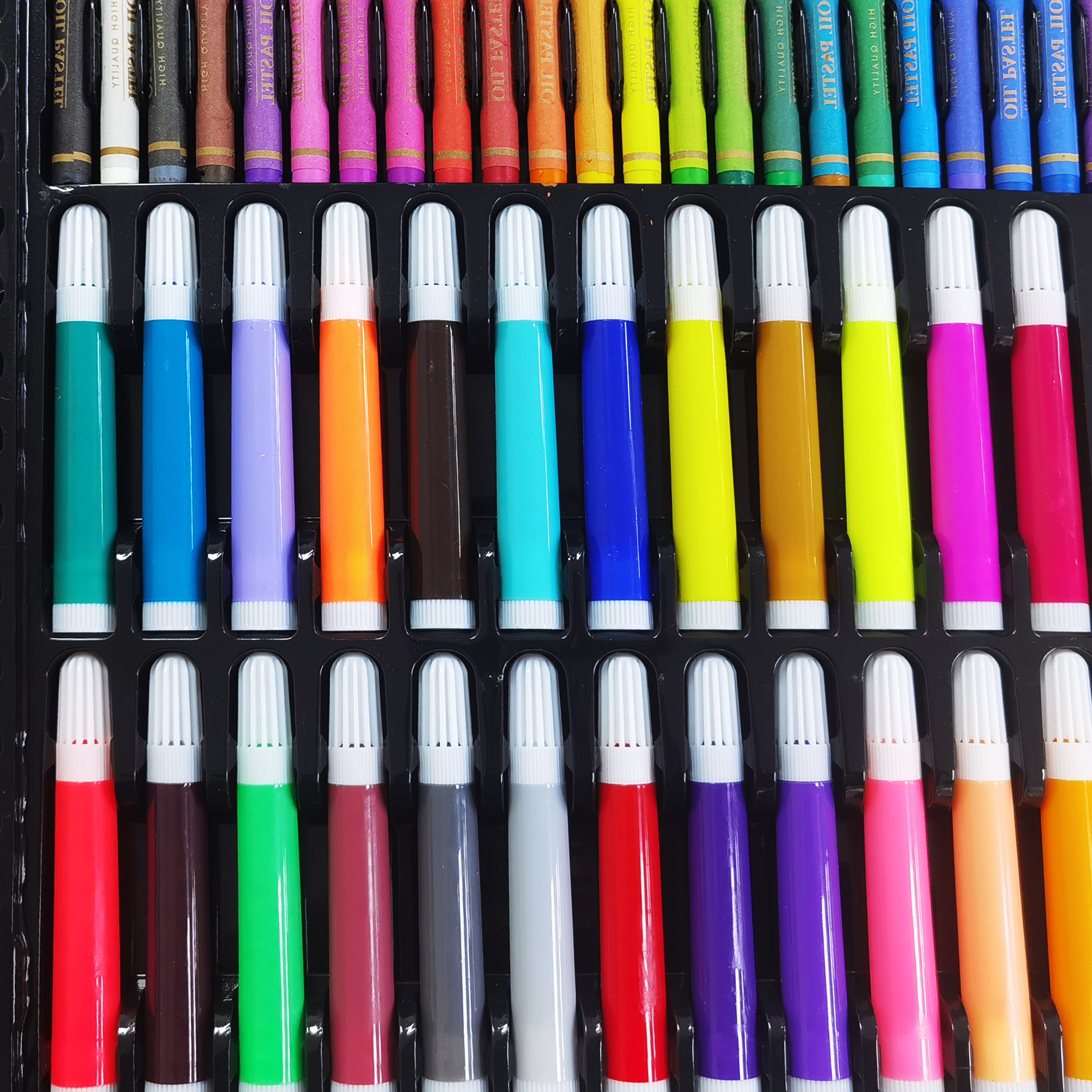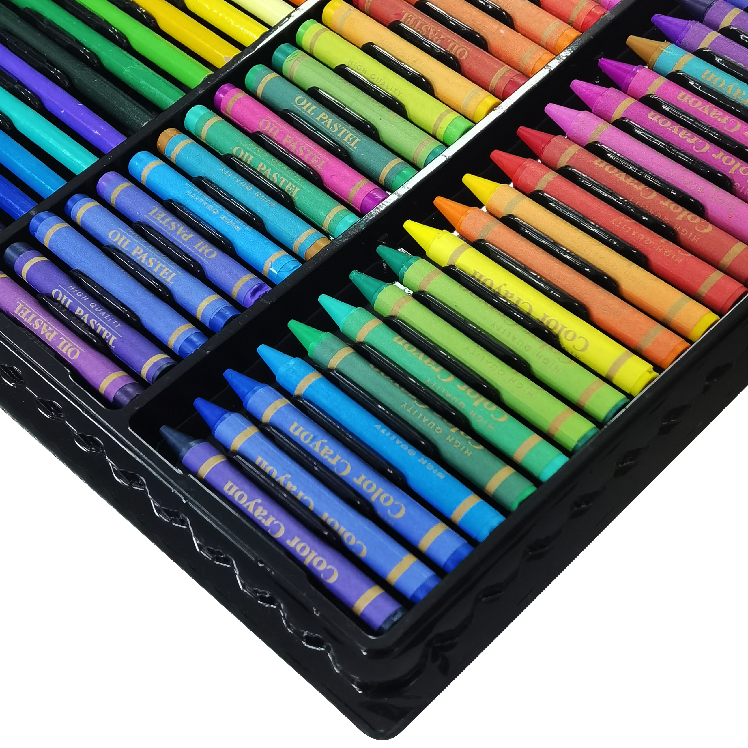 12 vodových barev, 48 olejových pastelů, 48 voskových pastelů, 24 pastelek, 24 fixů, gumu, štětec, korektor, lepidlo, 5 listů pro malování.