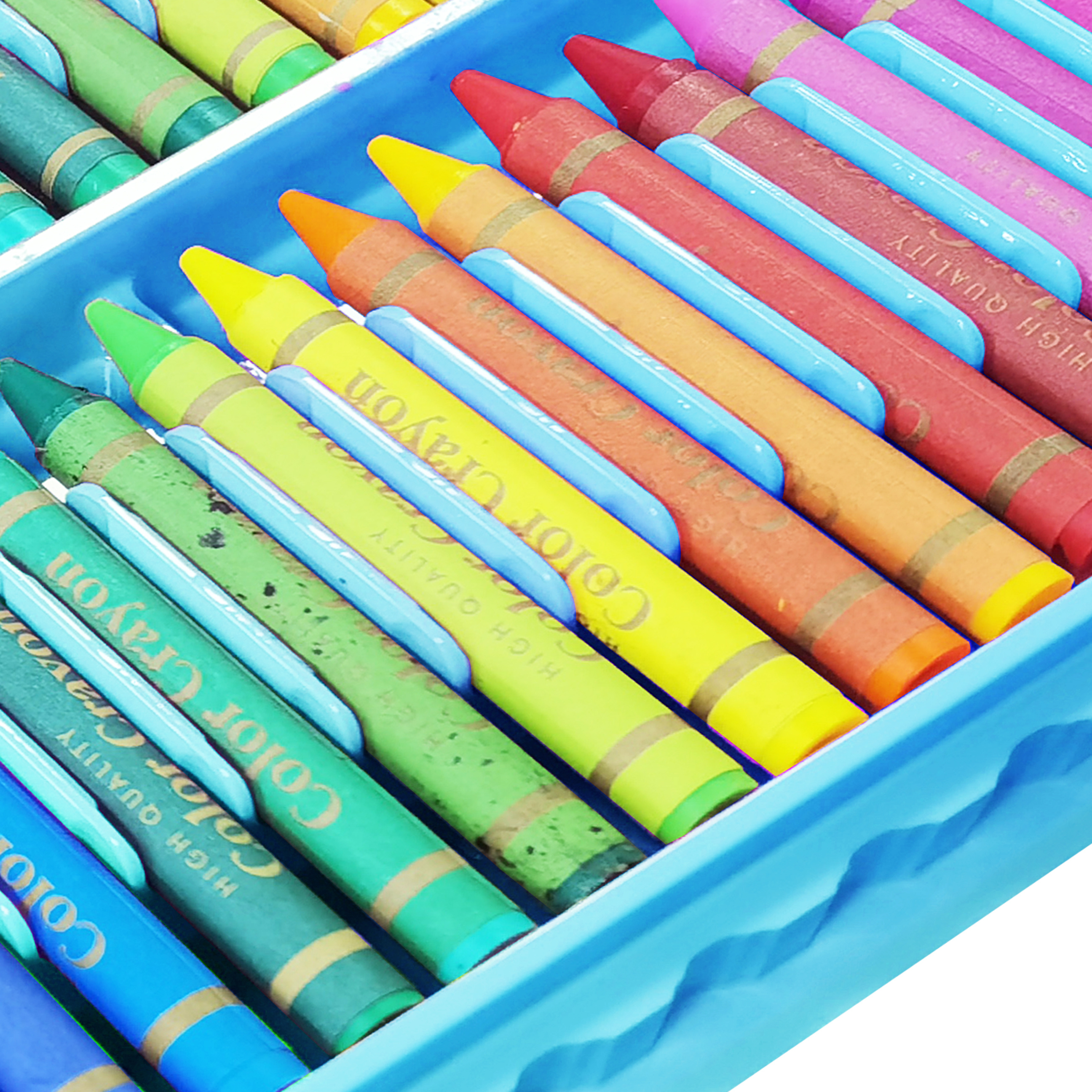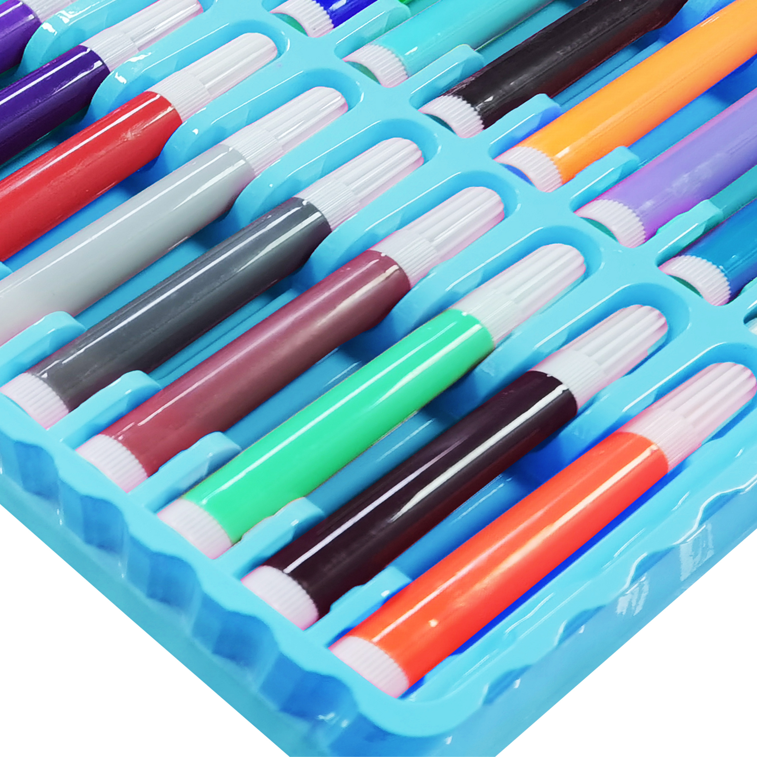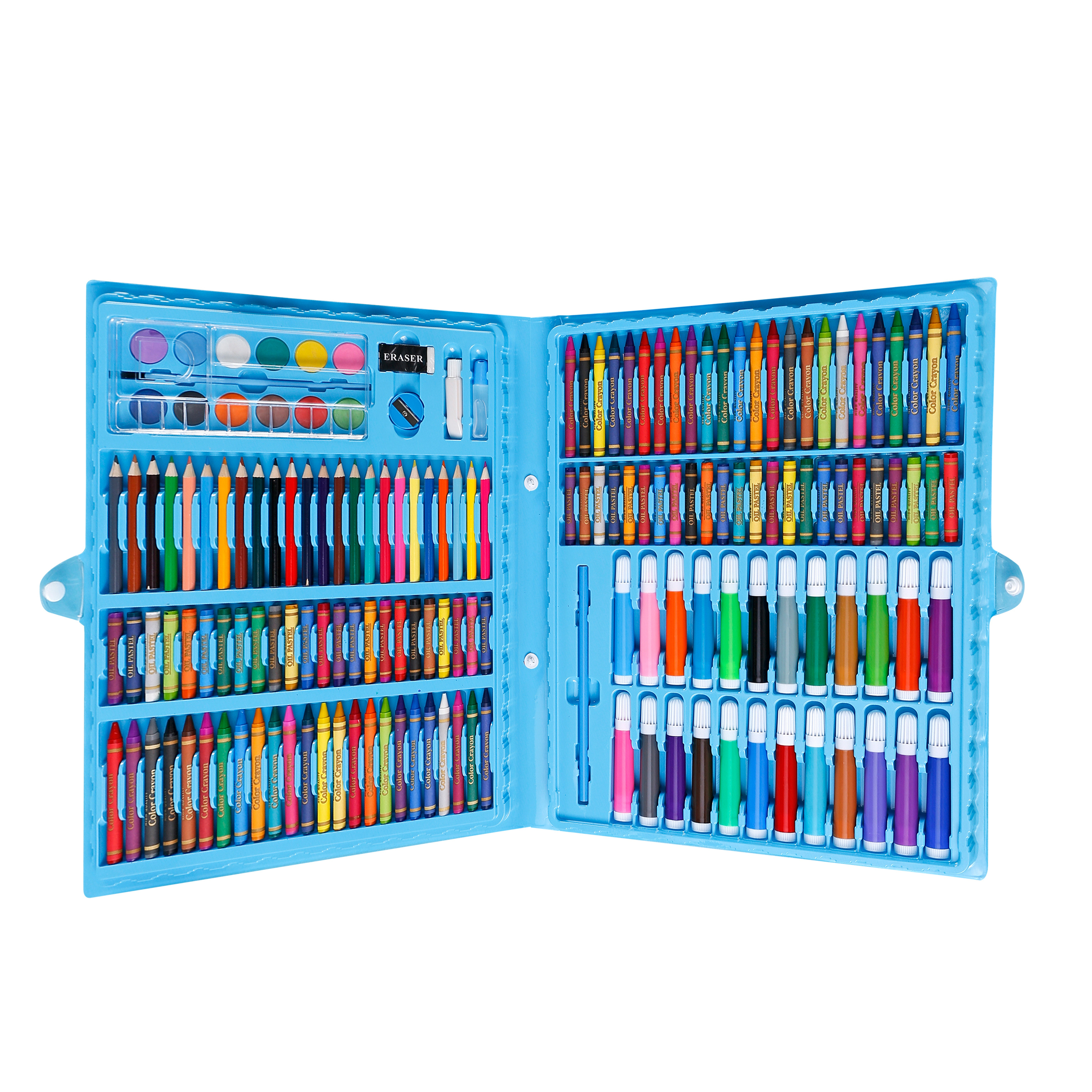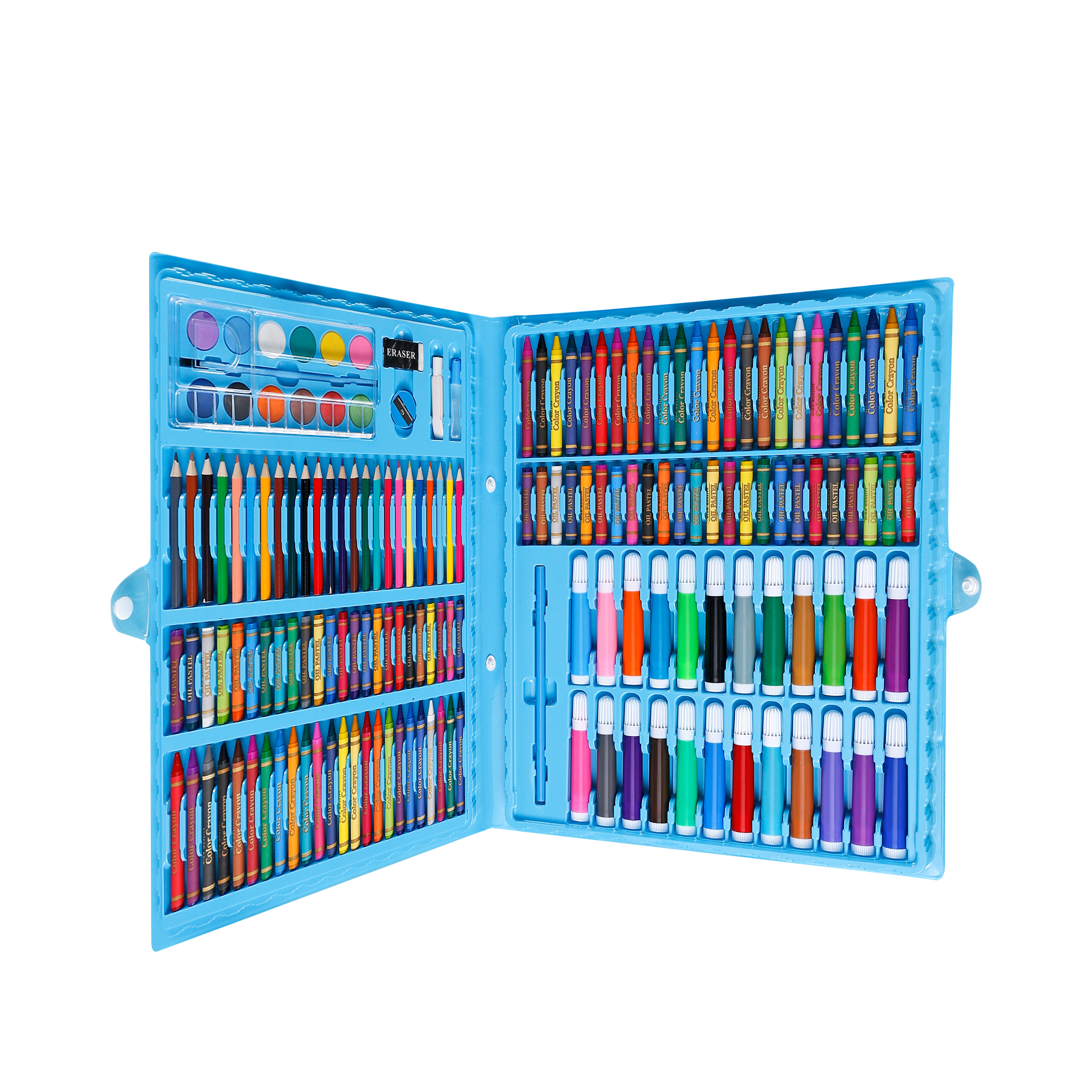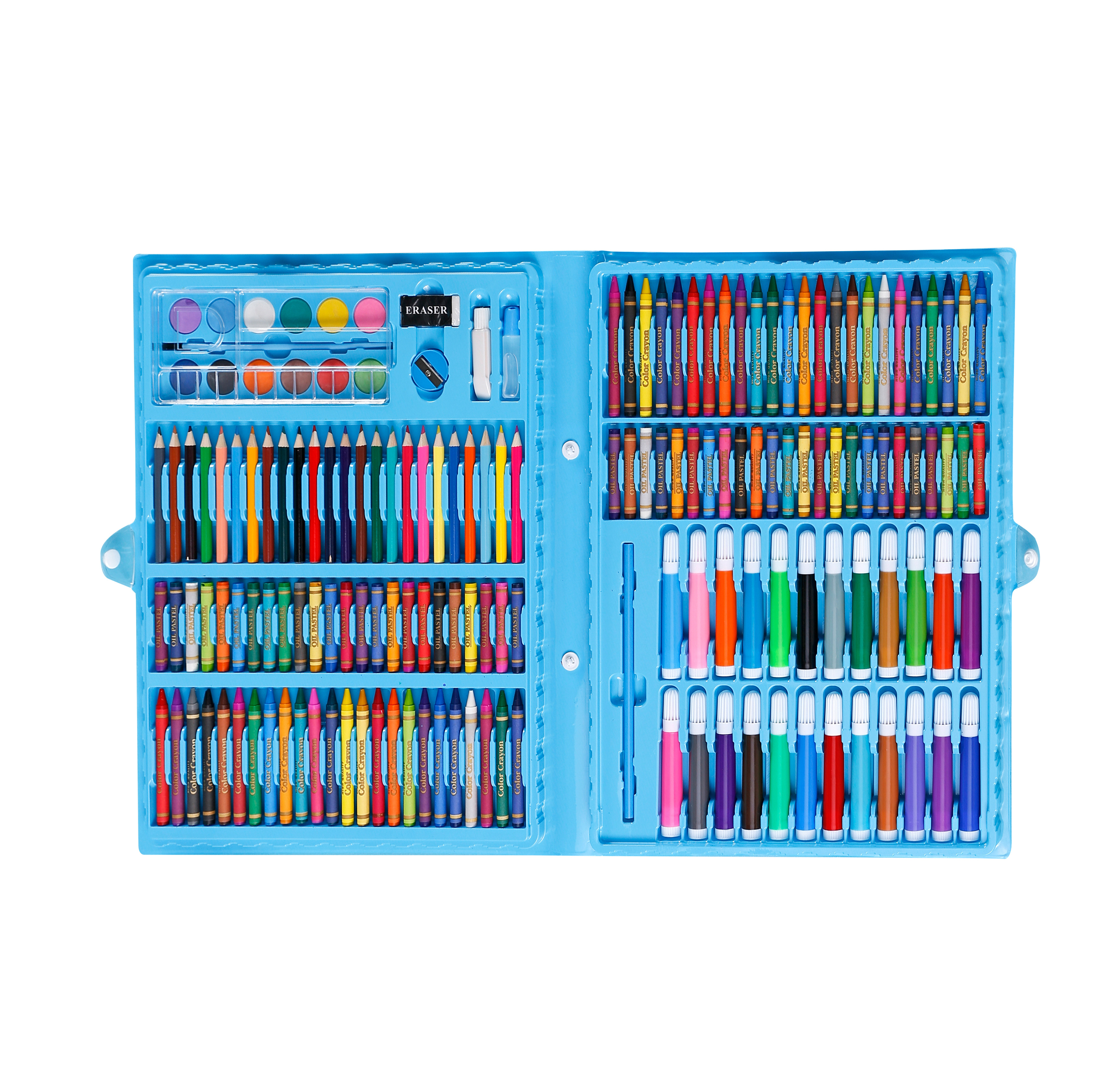 12 vodových barev, 48 olejových pastelů, 48 voskových pastelů, 24 pastelek, 24 fixů, gumu, štětec, korektor, lepidlo, 5 listů pro malování.
