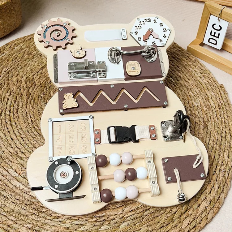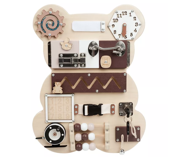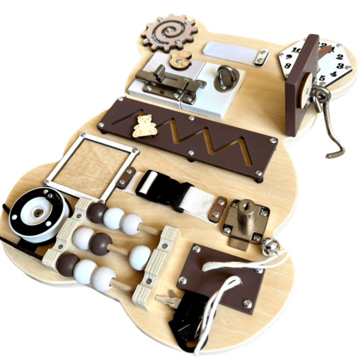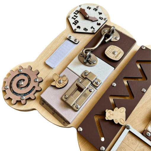 Edukační deska pro děti ve tvaru medvídka je skvělý způsob kde se děti přirozenou cestou pomocí hry vzdělávají, rozvíjejí dovednosti, tvořivost, kreativitu, logické myšlení, trpělivost a jemnou motoriku.