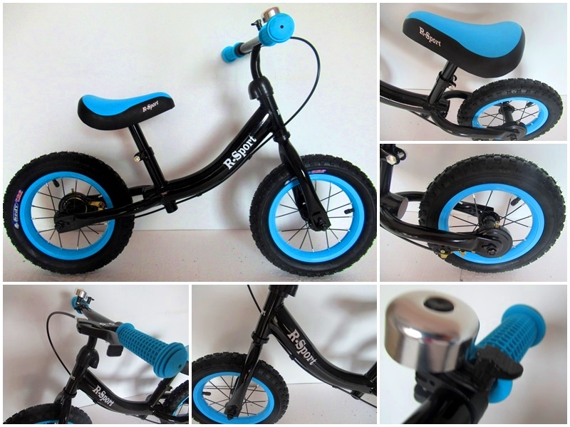 Odrážedlo je vybaveno lehkým hliníkovým rámem, výškově nastavitelným sedadlem a řídítky, 12" nafukovacími koly, ruční brzdou pro zadní kolo, zvonkem a protiskluzovými gripy řidítek.
