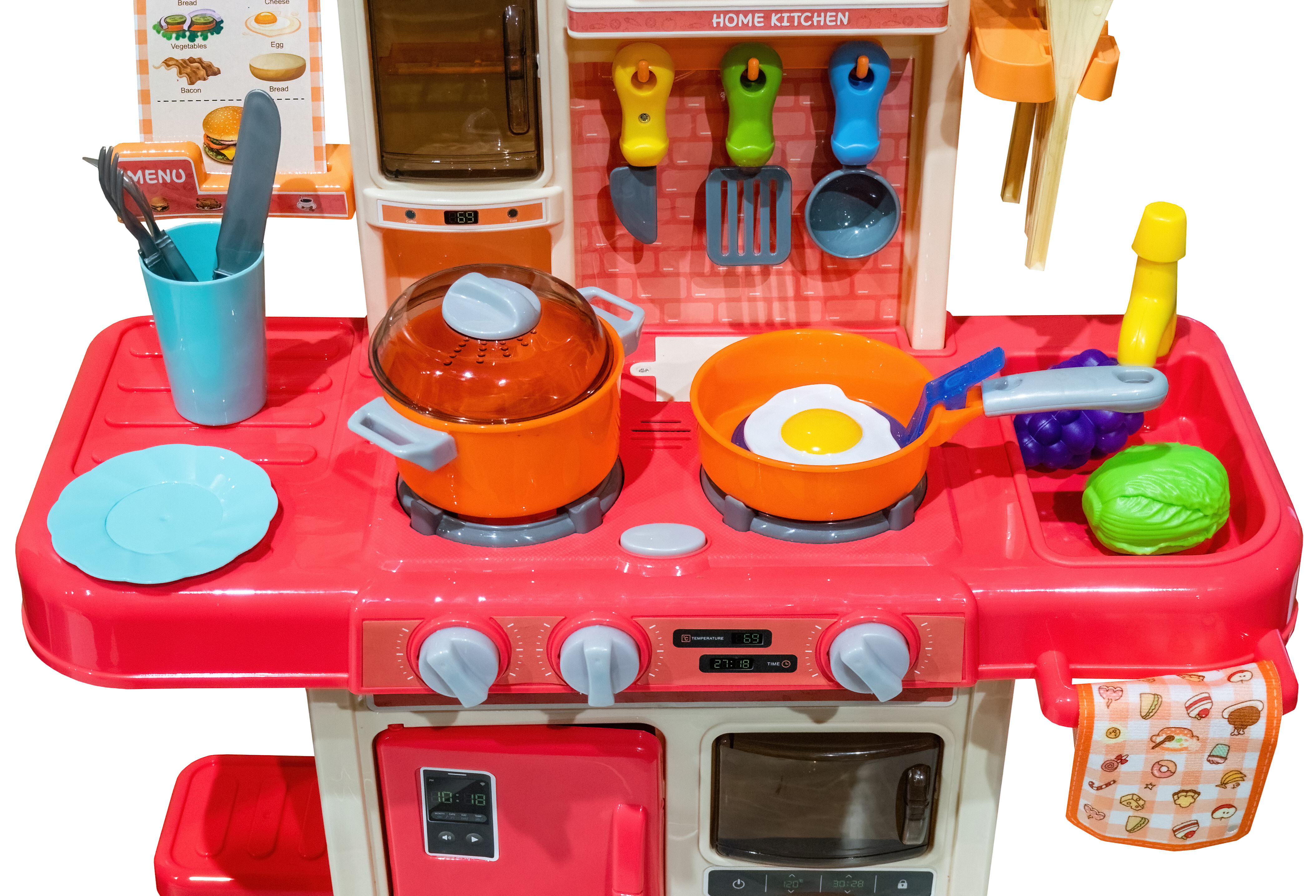 - Obsahuje spoustu různého příslušenství jako jsou hrnec, pánvička, pokličky, talíře, náčiní, jídlo aj.
