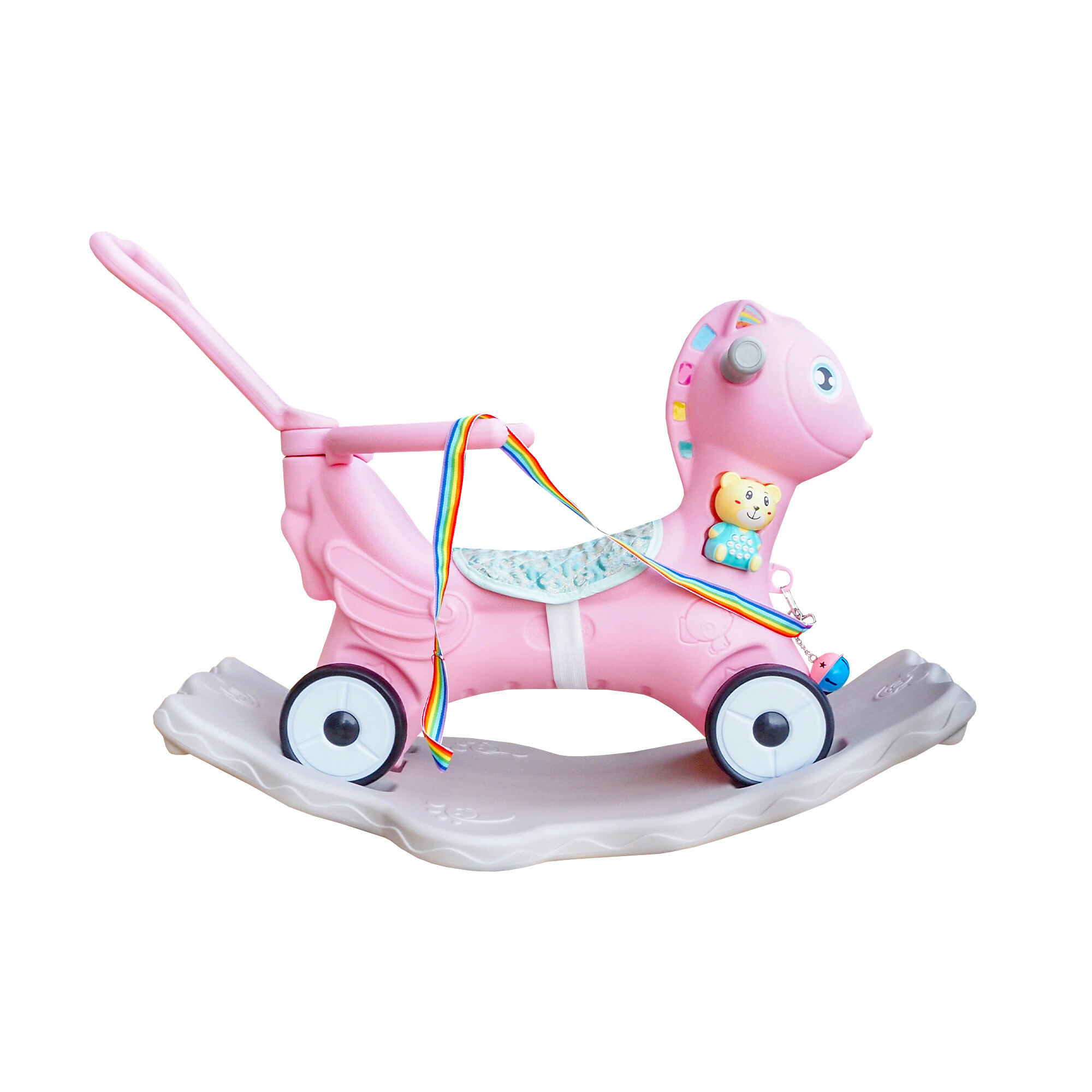Na krku koníka se nachází interaktivní medvídek, který vydává různé zvuky a melodie. Tato hračka nejenže zaujme pozornost vašeho dítěte, ale také stimuluje jeho sluchové vnímání a podporuje rozvoj hudebního cítění.