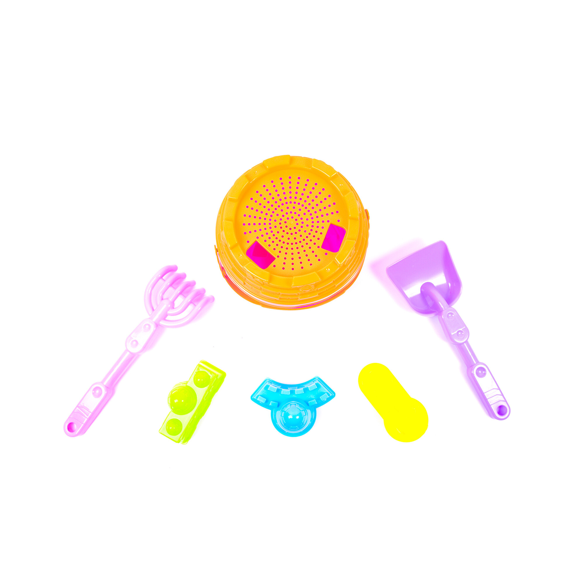 Sada obsahuje: Sítko, lopatku, hrábě, kyblík a bábovičky.