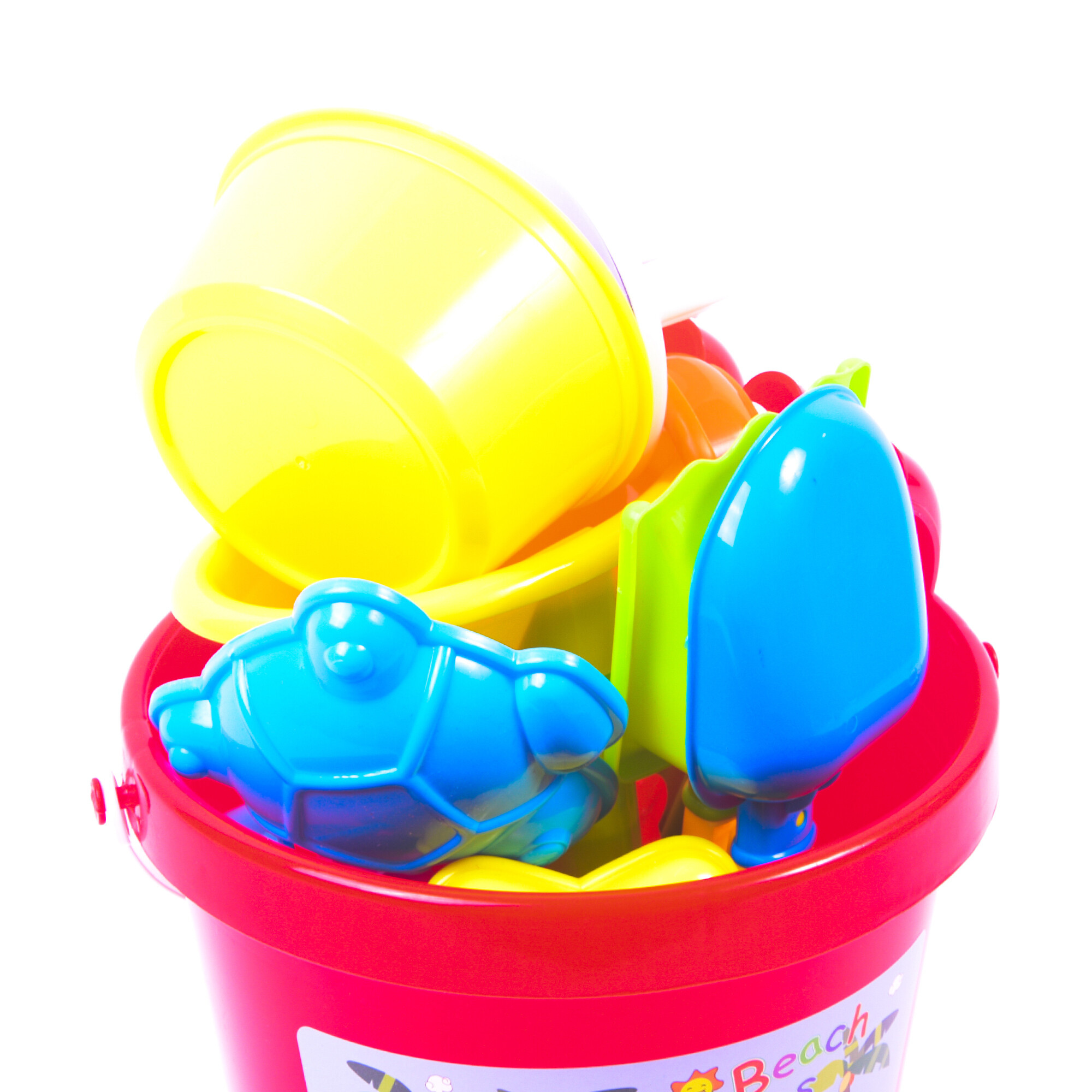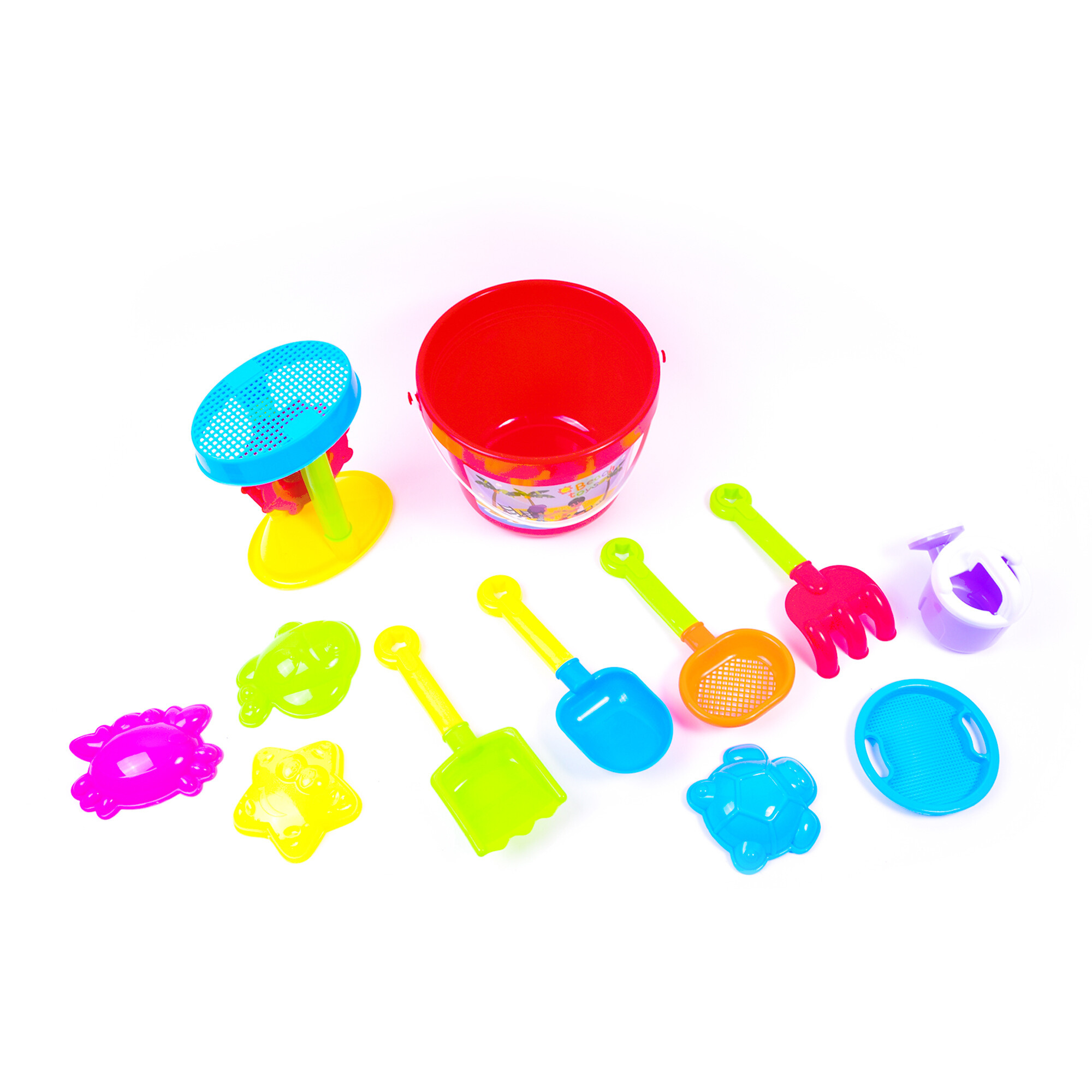 Sada obsahuje: Sítka, lopatky, hrábě, kyblíky, konvičku a bábovičky.