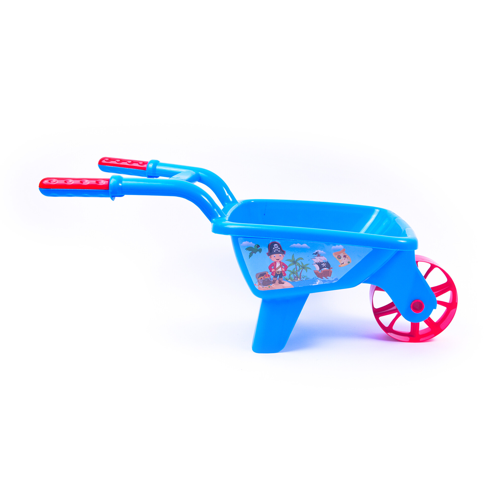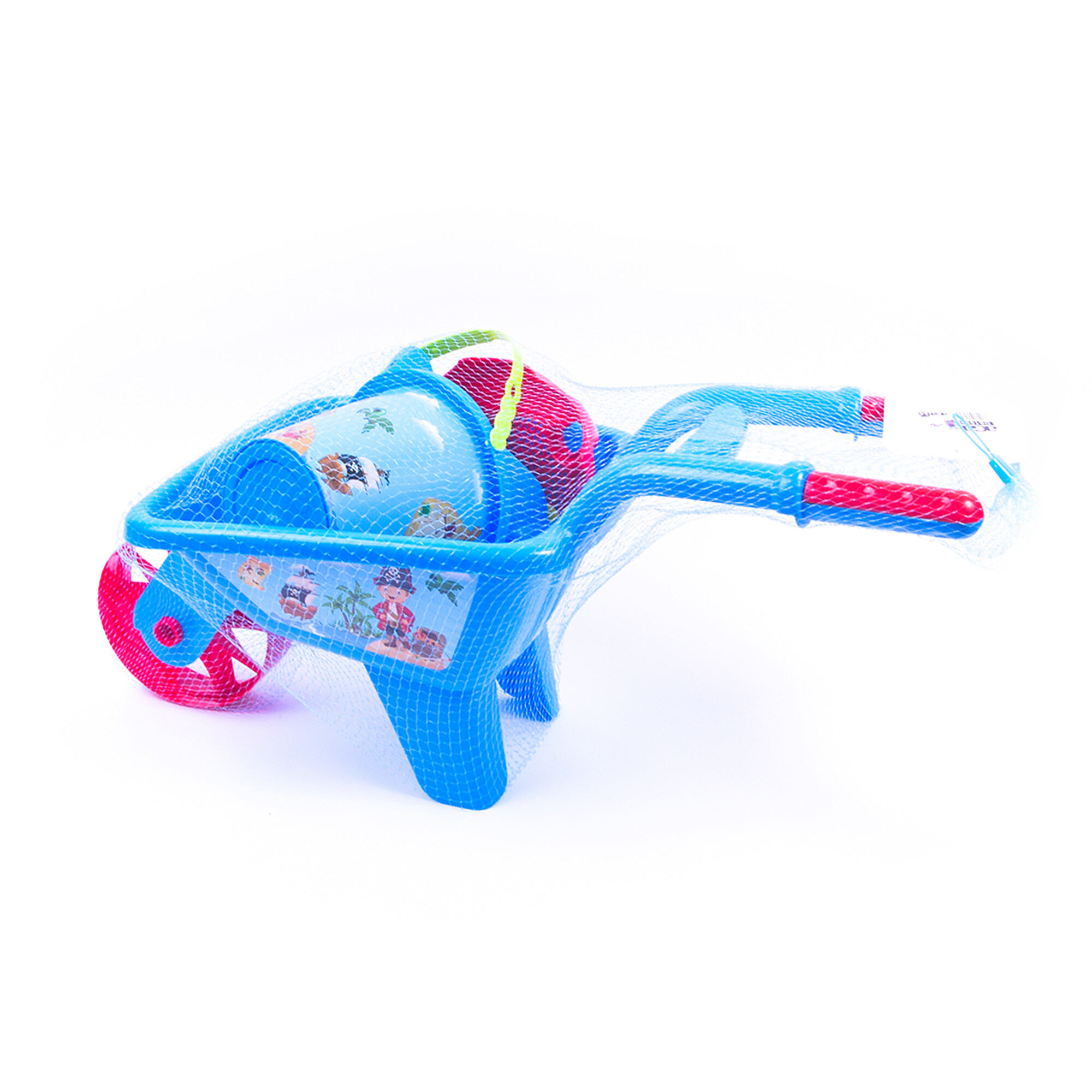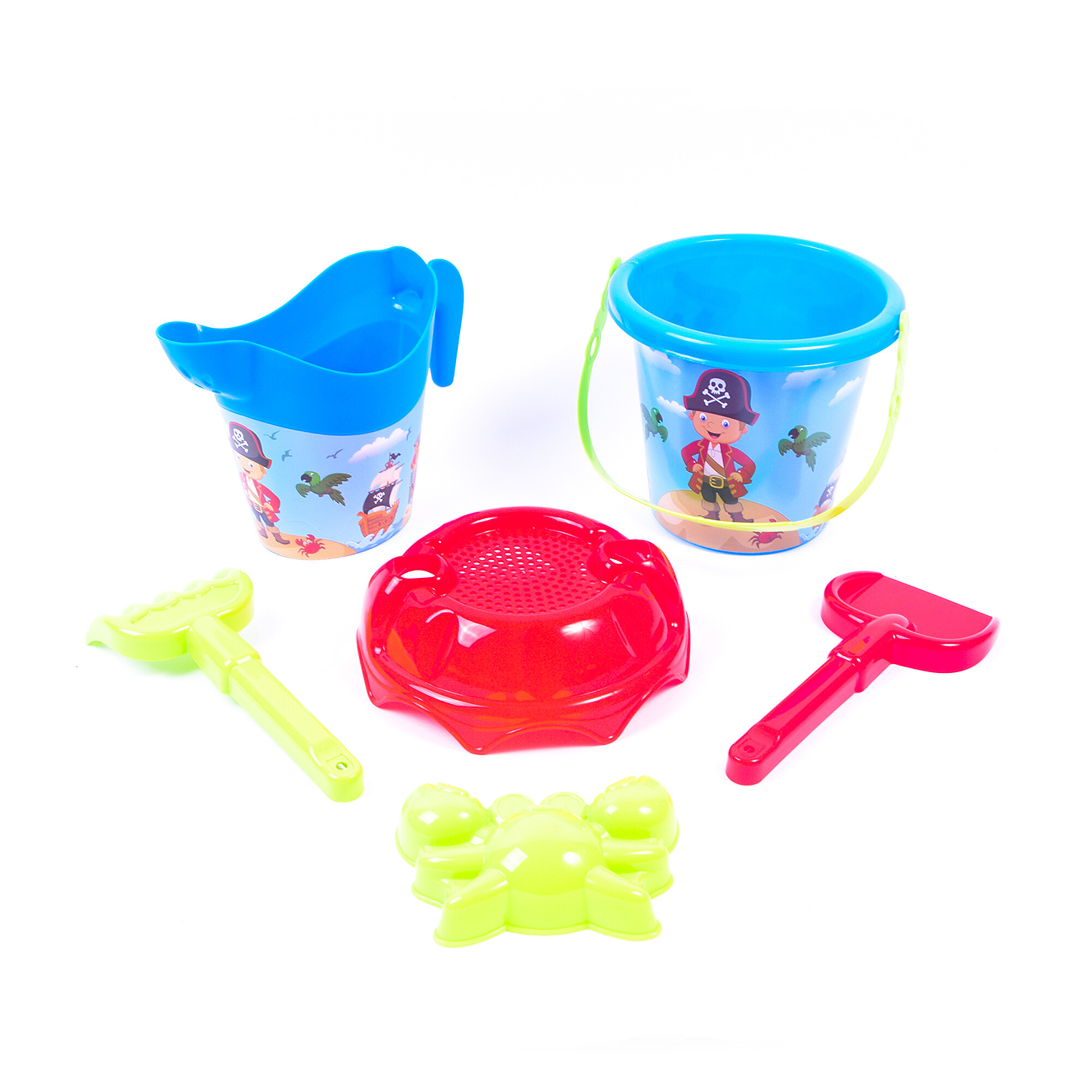 Sada obsahuje: Sítko, lopatku, hrábě, kyblík, zahradní kolečko, konvičku a bábovičky.