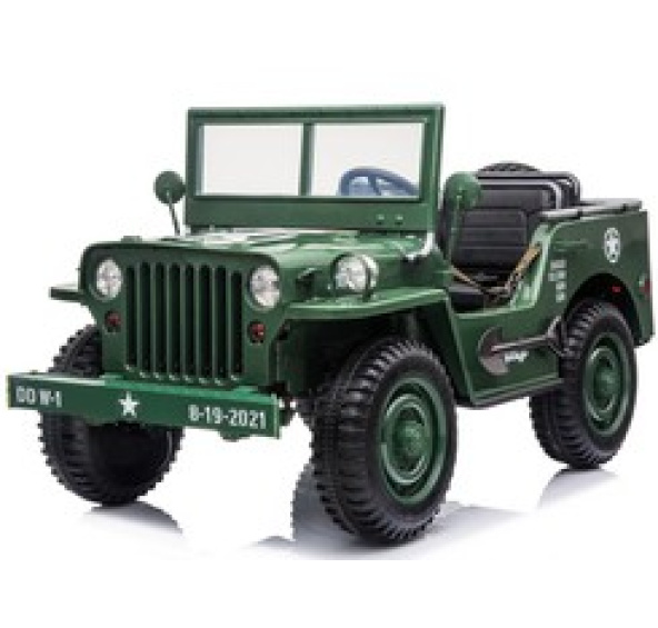 Vojenské terénní vozidlo, 3místné je nabídka pro všechny děti, které mají rády vojenskou tematiku. Vojenský džíp, silné, výkonné, velké, masivní vozidlo, které je jistě vhodné pro vojenské úkoly. Jak se na takové vozidlo sluší, byl tento vojenský terénní vůz vybaven veškerým potřebným příslušenstvím a výzbrojí. Vůz s pohonem všech kol má možnost přepínání mezi oběma motory, takže je na řidiči, aby se rozhodl, kdy použije konkrétní pohon. Vůz byl vybaven úložnými prostory, kufrem a lopatou. Má zvukové a světelné efekty, sklopné čelní sklo a široká sedadla. Vozidlo lze ovládat dálkovým ovládáním nebo samostatně řidičem.
