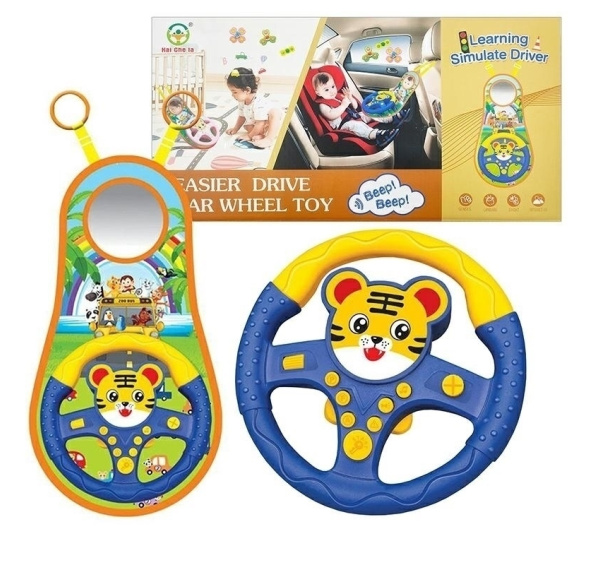 Interaktivní podložka na sedadlo spolujezdce v autě. Hračka obsahuje zrcátko a volant, které účinně zabaví a zaměstnají dítě během cesty autem. Specifikace: rozměry: 22x43x8cm 2 plastové závěsy pro montáž na opěrku hlavy volant přehrává veselou hudbu a zvuky vozidel 5 písniček zvuk policejní sirény, hasičského vozu a sanitky zvuk klaksonu regulace hlasitosti možnost otočení volantu o 360 stupňů. Hračka určená pro děti starší 3 let.