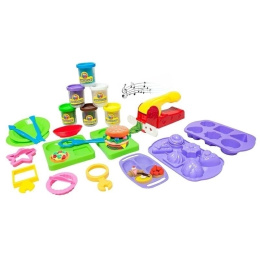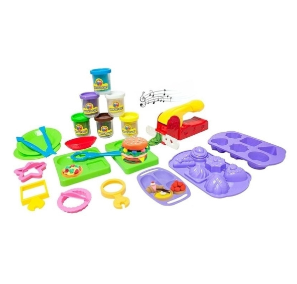 Burgerárna - výrobna fastfoodů z modelíny. V sadě se nachází stroj na výrobu fastfoodů a nádobí na výrobky z modelíny. Hračka ovlivňuje rozvoj představivosti a manuálních dovedností dítěte! Díky naší sadě se dítě učí tvary a barvy! Specifikace: světelné a zvukové efekty rozměry strojku: 15,5x8x13cm napájení: 2xAAA V sadě: 6 barevných kelímků s modelínou strojek na fastfoody ostatní prvky sady (2 velké formy, 2 malé formy, tác na servírování hamburgerů, 2 talířky, miska, 4 tvary na vykrajování, příbory) rozměry balení: 42x30,5x9,5cm Množství ks. v kartonu: 12