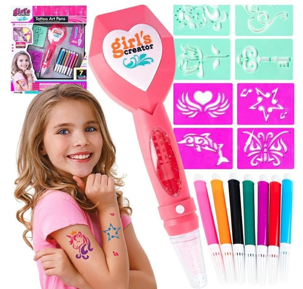 Sada na přípravu tetování jak pro děti, tak pro dospělé. Produkt se osvědčí na každé párty, dodá lesk a úsměv všem účastníkům. Tetování jsou velmi trvalá, různých velikostí a v různých vzorech. Všechny materiály použité k provádění tetování jsou bezpečné pro zdraví. napájení strojku: 2xAAA V sadě: 8 šablon 7 fixů strojek na tetování o rozměrech. 20x7x3cm Produkt určený pro děti starší 3 let. rozměry balení: 33x28x8cm Počet ks. na paletě: 144
