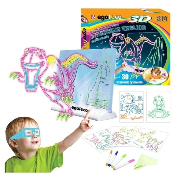 Magická tabulka / tabule na kreslení ve 3D. Stačí nakreslit obrázek, zapnout podsvícení, nasadit přiložené brýle a každý obrázek získá trojrozměrný efekt! To je skvělá zábava pro děti v každém věku. Nakreslené obrázky lze snadno setřít pomocí přiložené utěrky. Značka: Egaleco Specifikace: napájení na baterie: 3xAA (není součástí balení) tabule s LED podsvícením 4 barevné fixy hadřík na stírání kresby 3D brýle 15 oboustranných šablon (30 vzorů kreseb s různou úrovní obtížnosti) rozměry: 24,5x21x5,3cm Hračka je určena pro děti od 3 let. Množství ks. v kartonu: 288