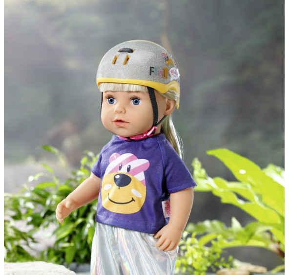Fííí, právě kolem prosvištěla malá stříbrná střela. Byla to BABY born ve své stylové helmě na kolo. Stříbrná helma pro větší bezpečnost na cestách se třpytí na slunci. Nejdřív je potřeba zapnout si přezku pod bradou, aby helma dobře držela, a můžeme vyrazit. Starší bratříček a sestřička si tuto helmu vždy nasazují i při skejtování.