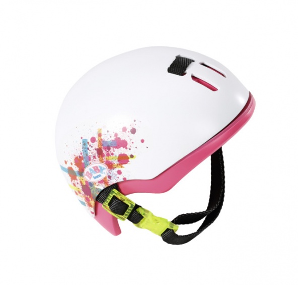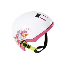 Bezpečnost je při jízdě na kole tím nejdůležitějším. A tak i BABY born® musí při jízdě na kole vždy nosit helmu. Její helma má úžasný aerodynamický design. Je bílorůžová a na straně je ozdobena krásným obrázkem. Nechybí jí ani bezpečnostní zapínání pod bradou, aby při jízdě náhodou nesklouzla. Helma skvěle ladí s BABY born® kolem a sedačkou na kolo.