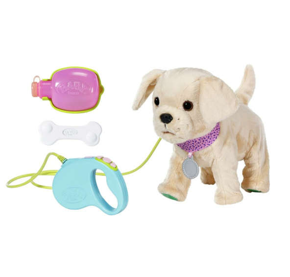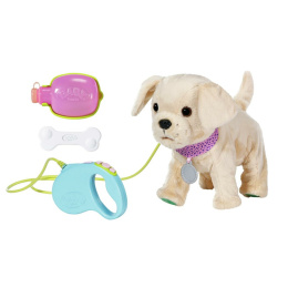 BABY born má nového zvířecího kamaráda. Když štěňátko pohladíš po zádech, zavrtí ocáskem a uslyšíš roztomilé psí zvuky. Umí pít vodu ze své mističky: vyplázne jazýček a uslyšíš, jak srká. Když zvedne hlavu, jazýček se vrátí zpátky do tlamičky – přesně tak, jako pije vodu z mističky opravdový pejsek. Po pití zvedne nožičku a vyčůrá se, oznámí to štěkáním. “Fuj, na koberec ne!” Rád si také hlasitě pochutná na své kostičce. Štěňátko je ovládáno pomocí tlačítek na vodítku.
