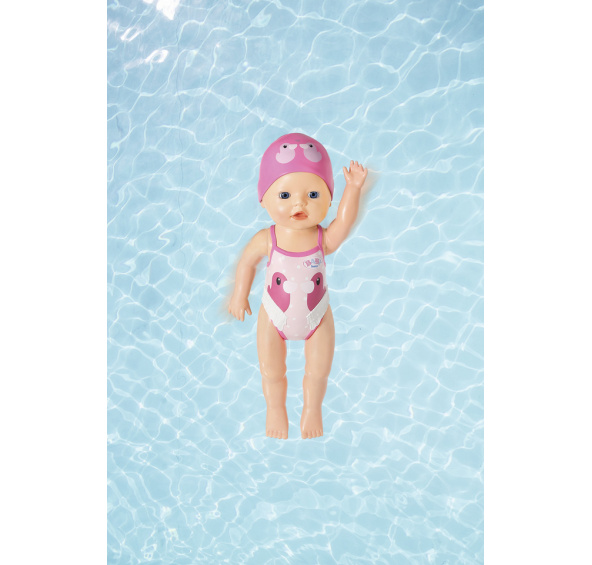 Malá holčička už se toho na hodině plavání tolik naučila. Nejraději má kraul a motýlka. Když plave kraul, střídá ve vodě jednu ruku za druhou, u motýlka rukama hýbe nastejno. A vše bez baterií! Stačí panence natáhnout ruce dozadu a je připravena na další kolo. Když jí ruce uvolníš, začne ve vodě plavat. Nohy a hlava „malého delfína“ jsou také pohyblivé, takže Plaváček může sedět na okraji bazénu a pozorovat svou maminku a tatínka. Plavací čepice a roztomilé plavky s motivem kačenky Berty a s legračními volánky jsou natištěny přímo na těle panenky jako reliéf.Plave kraula a motýlka, není třeba baterií.Tělo panenky je vyrobeno z vodotěsného materiálu. Velikost panenky 30 cm.