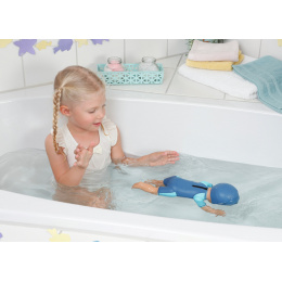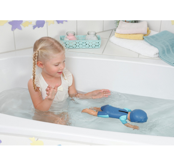 Malý chlapeček už se toho na hodině plavání tolik naučil. Nejraději má kraul a motýlka. Když plave kraul, střídá ve vodě jednu ruku za druhou, u motýlka rukama hýbe nastejno. A vše bez baterií! Stačí panence natáhnout ruce dozadu a je připravena na další kolo. Když jí ruce uvolníš, začne ve vodě plavat. Nohy a hlava „malého delfína“ jsou také pohyblivé, takže Plaváček může sedět na okraji bazénu a pozorovat svou maminku a tatínka. Plavací čepice a roztomilé plavky s motivem kačenky Berty a s legračními volánky jsou natištěny přímo na těle panenky jako reliéf.Plave kraula a motýlka, není třeba baterií.Tělo panenky je vyrobeno z vodotěsného materiálu. Velikost panenky 30 cm.