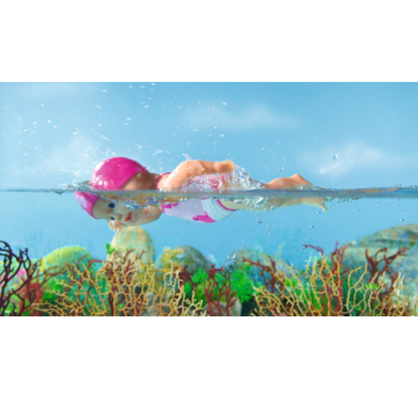Malá holčička už se toho na hodině plavání tolik naučila. Nejraději má kraul a motýlka. Když plave kraul, střídá ve vodě jednu ruku za druhou, u motýlka rukama hýbe nastejno. A vše bez baterií! Stačí panence natáhnout ruce dozadu a je připravena na další kolo. Když jí ruce uvolníš, začne ve vodě plavat. Nohy a hlava „malého delfína“ jsou také pohyblivé, takže Plaváček může sedět na okraji bazénu a pozorovat svou maminku a tatínka. Plavací čepice a roztomilé plavky s motivem kačenky Berty a s legračními volánky jsou natištěny přímo na těle panenky jako reliéf. • Originální panenka BABY born. • Tělo panenky je vyrobeno z vodotěsného materiálu. • Po otočení ručiček plave kraula a motýlka. • Není třeba baterií. • Velikost 30 cm. • Vhodná pro děti od 12 měsíců. BABY born My First Plaváček ve velikosti 30 cm.