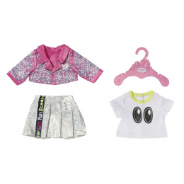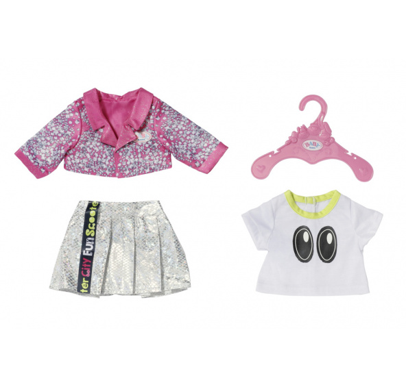 Skvělý outfit do města pro panenky BABY born. BABY born je nadšená z bílého trička, ze kterého se dívají dvě obrovské oči. Přes „zvědavé“ tričko nosí BABY born růžovou bundu s potiskem malých diamantů. Třpytivá stříbrná skládaná sukně je ozdobena černou stuhou s barevným potiskem. • Souprava v rockovém vzhledu. • Třpytivá sukýnka, sáčko v moderním vzhledu a tričko s vtipným potiskem. • Součástí je ramínko. • Pro panenky velikosti 43 cm. • Možno prát v ruce ve vlažné vodě. Nesušit v sušičce. • Balení: papírová karta s ramínkem na zavěšení.