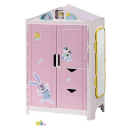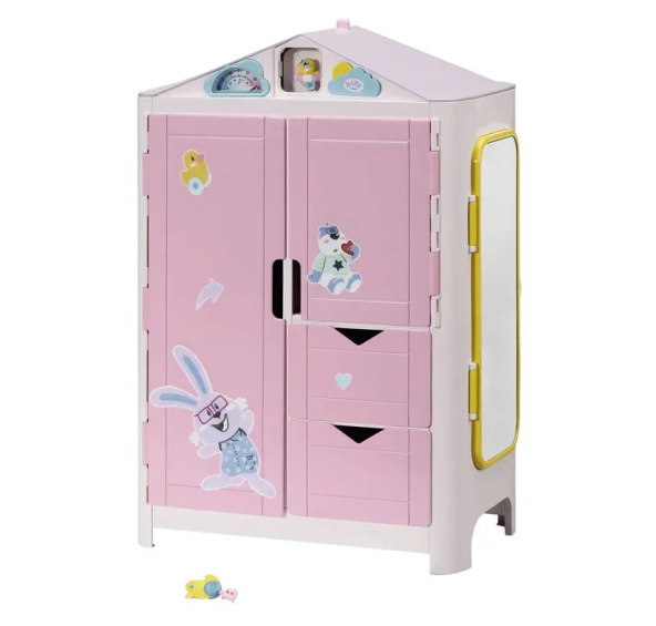 I tvá panenka Baby Born potřebuje úložný prostor. Tato skříň ti nabídne ještě víc. Stiskni tlačítko na vrchu a kačenka ti ukáže, jaké bude počasí. Obsahuje i tajnou přihrádku na cenosti. Zrcadlo umístěné na boku můžeš polohovat. Balení obsahuje nálepky, kterými si můžeš svou skříň vyzdobit. Rozměry cca 34 × 54 cm. Pro panenky velikosti 36 – 43 cm. Panenka není součástí balení.