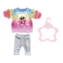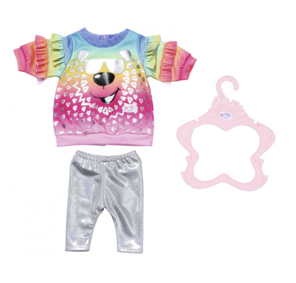 Volné svetry jsou jedním z nejnovějších módních trendů. Starší sestřička BABY born má jeden takový opravdu stylový. Svetr v duhových barvách je potištěn krásným třpytivým motivem a na rukávech ho zdobí volánky. Ke svetru se perfektně hodí stříbrné legíny. • Originální obleček pro panenky BABY born. • Pro nápaditou, rozmanitou a dlouhotrvající hru. • Vhodný pro všechny panenky BABY born ve velikosti 43 cm. BABY born Starší sestřička Oblečení se svetříkem pro panenky ve velikosti 43 cm. Součástí je ramínko.