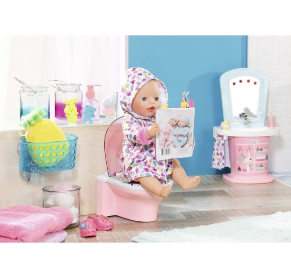 Když si BABY born® sedne na toaletu, zazní melodie. A když má hotovo, je odměněna aplausem. Stisknete-li několikrát sedátko, uslyšíte pšouk a smích nebo zvuky čůrání, aplaus a smích. Stisknutím splachovacího tlačítka se aktivují zvuky spláchnutí.