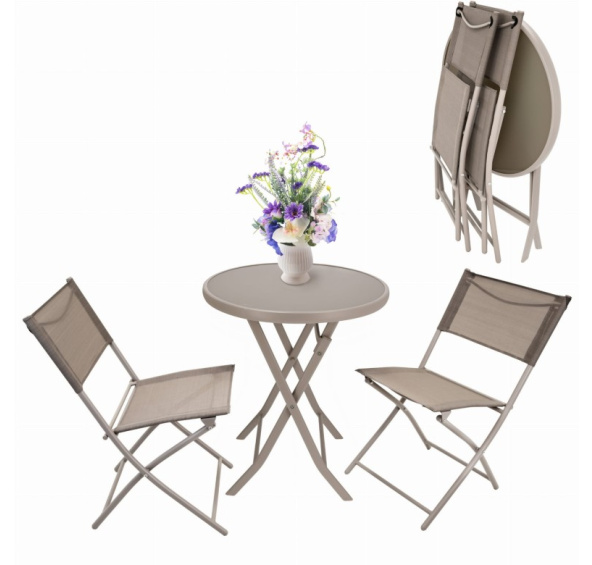 Sada nábytku na malý balkon, obsahující dvě skládací židle a stolek.Skládací souprava nabízí flexibilitu v řízení prostoru, přičemž zachovává pohodlí užívání.Navíc malé rozměry usnadňují skladování nábytku mimo sezónu.