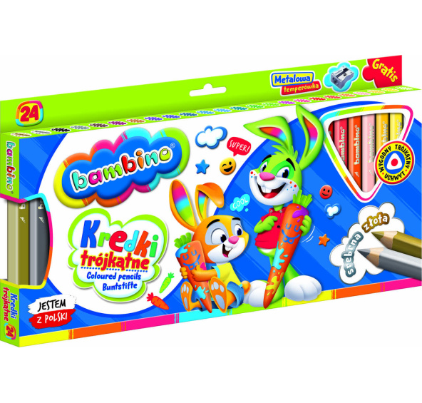 Senzační trojhranné tužky v dřevěném rámečku od společnosti BAMBINO. Poskytují vynikající pokrytí povrchu a vyplňují velké plochy. Sada obsahuje: 24 barev pastelek, ořezávátko. Dlouhá. pastelky: 15 cm. Rozměry. balení: 35x20x2cm.